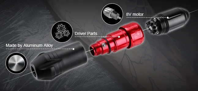# Тонкая конструкция с ЧПУ # Картридж-игольчатый интерфейс # Принимает все основные бренды картриджей для ручки татуировки # Нескользящая ручка # Регулируемая ручка # Авиационный Космический алюминиевый корпус # DC питание подключено.