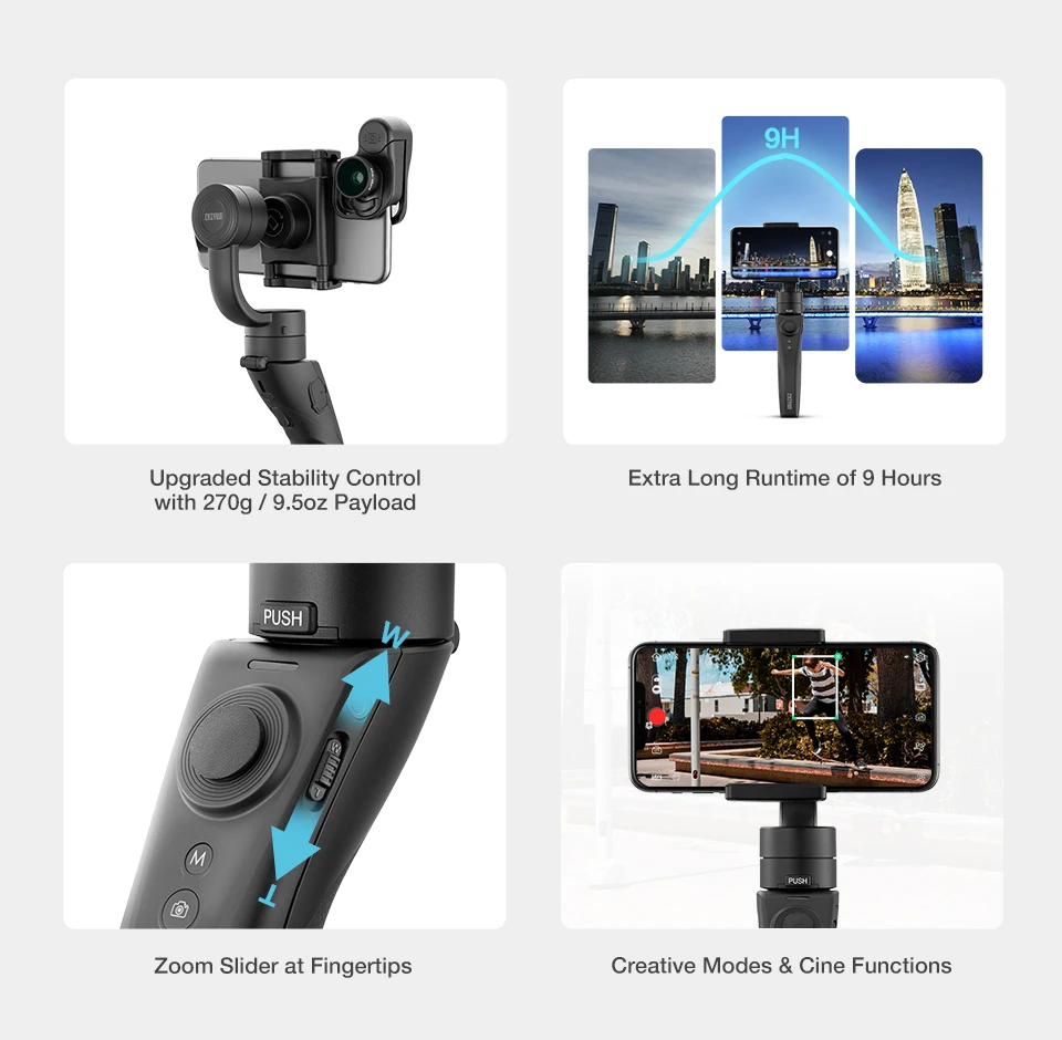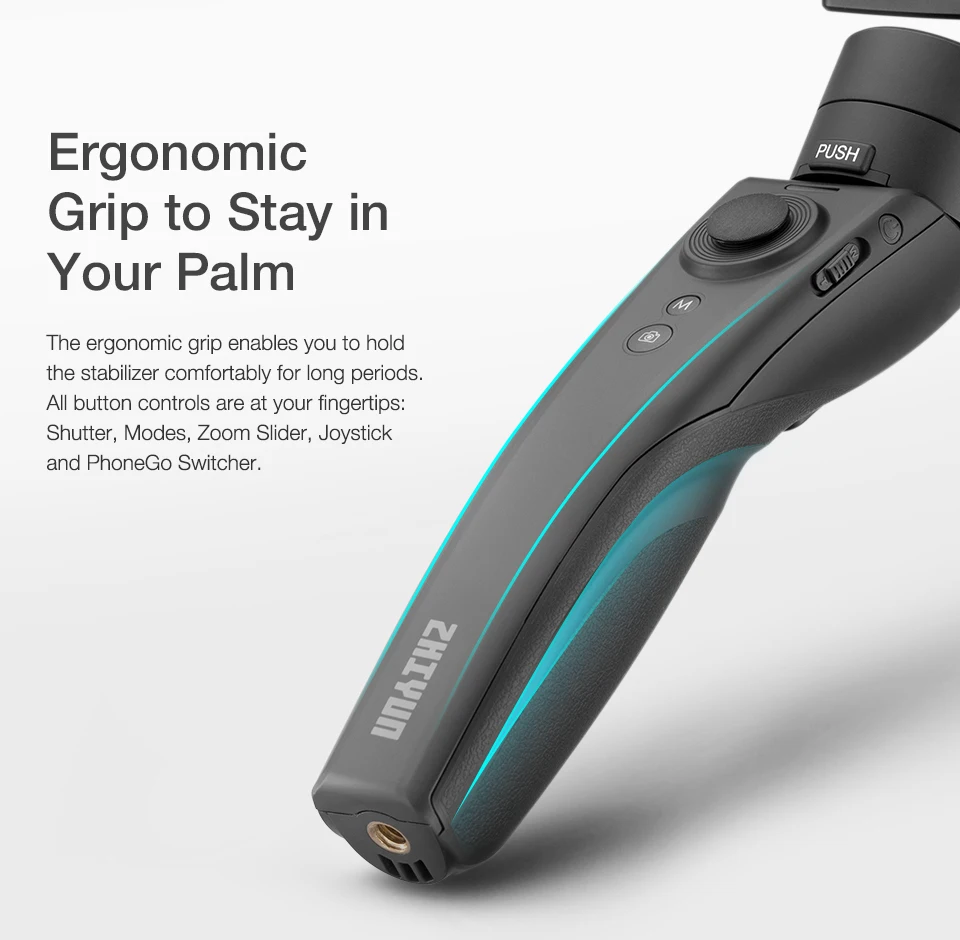 Эргономичный захват позволяет удобно держать стабилизатор в течение длительного времени. Все кнопки управления у вас под рукой: затвор, режимы, слайдер зума, джойстик и переключатель PhoneGo.