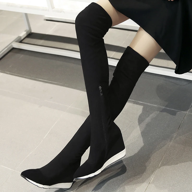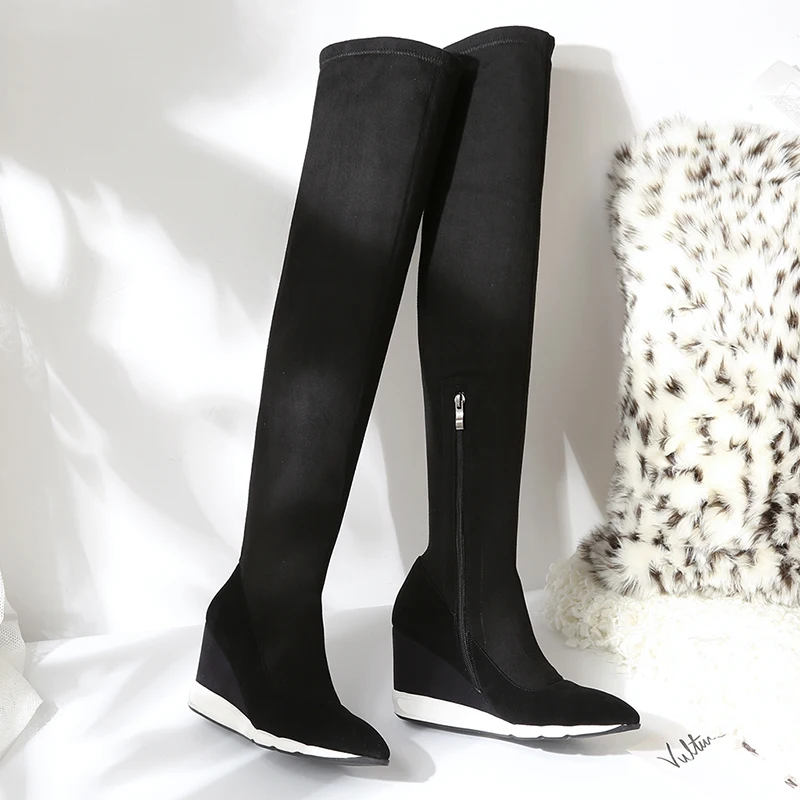 Оригинальные Соблазнительные ботфорты выше колена; Женская обувь черного цвета с острым носком на танкетке; Удобная обувь из флока; Женская элегантная обувь на высокой платформе. Пожалуйста, используйте нашу таблицу размеров при выборе размера.