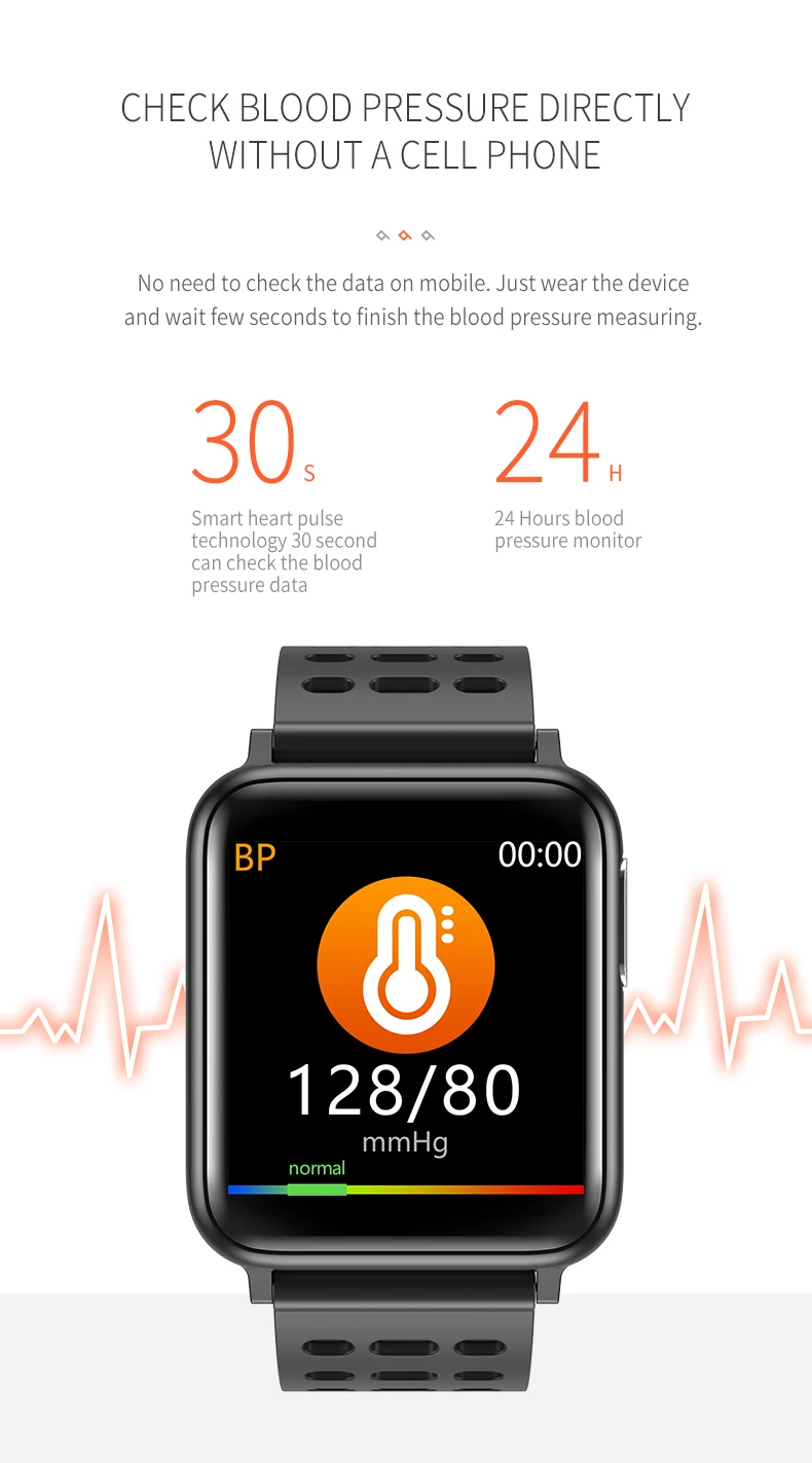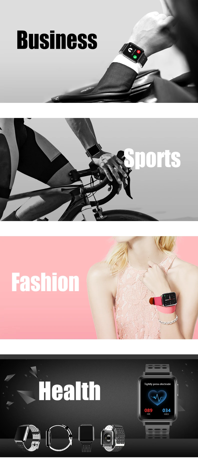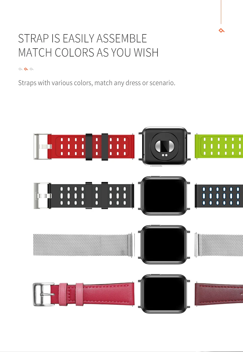 Для этих часов V5 имеется 3 ремешка: Повседневный (Гладкий), спортивный (с отверстиями), стальной. Пожалуйста, проверьте их отличие от цветовых полос. Вы можете выбрать одни часы и добавить дополнительный ремешок, например: повседневные часы с спортивным ремешком, повседневные часы со стальным ремешком. При покупке отправьте нам сообщение о желаемом цвете. Варианты цвета корпуса часов: черный, серебристый Варианты цвета спортивного ремешка: черный, черный, красный, черный, зеленый, черный, белый Варианты цвета повседневного ремешка: черный, красный, синий, белый Варианты цвета стального ремешка: черный, серебристый Характеристики и функции: Экран: 1,3 ''TFT, квадратный цветной экран с сенсорной кнопкой; Аккумулятор: литий-ионный 160 мАч, перезаряжаемый, Магнитная Зарядка через USB, регулярная работа в течение 3-5 дней; Водонепроницаемость: IP67 Стандартная защита от пыли и воды, но пожалуйста, не носите его для горячего душа; Bluetooth 4,0, пожалуйста, установите приложение на мобильный телефон в сопряжение BT, Совместимость с мобильным телефоном в системах Android 4,3/iOS 7,0 и выше; Социальные функции: время и дата, будильник, секундомер, удаленная камера, сидячий сигнал, Спортивные функции: шагомер, калории, монитор сна, Функции здоровья: пульс, артериальное давление, SPO2, PPG, ЭКГ; Напоминания (требуется сопряжение BT с мобильным телефоном): напоминание по телефону, напоминание о сообщениях/twitter/facebook/whatsapp Примечание: Это не для профессионального медицинского использования, данные HR/BP/кровяного кислорода/PPG/ЭКГ только для справки. Пожалуйста, не покупайте и не используйте его в качестве профессионального монитора здоровья.