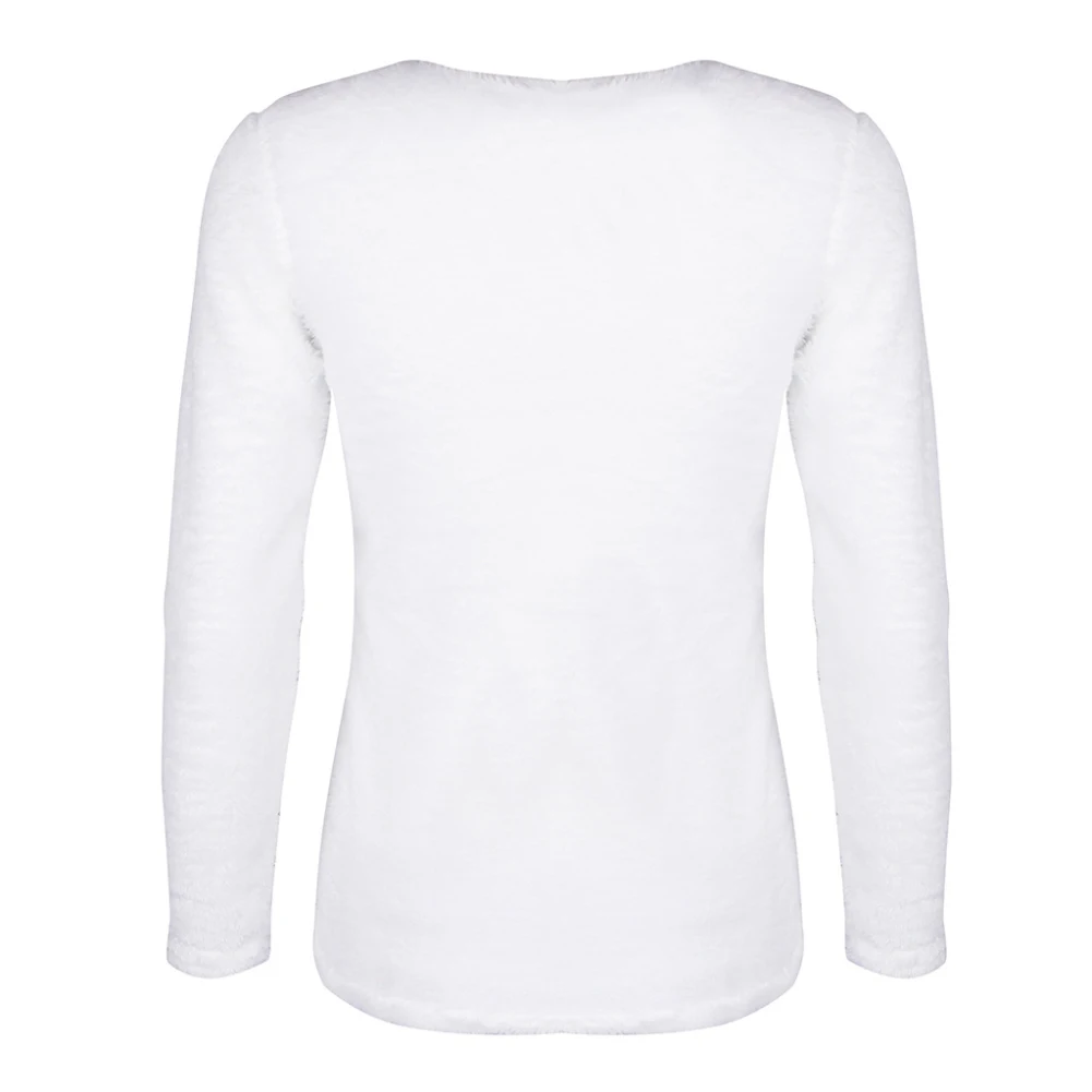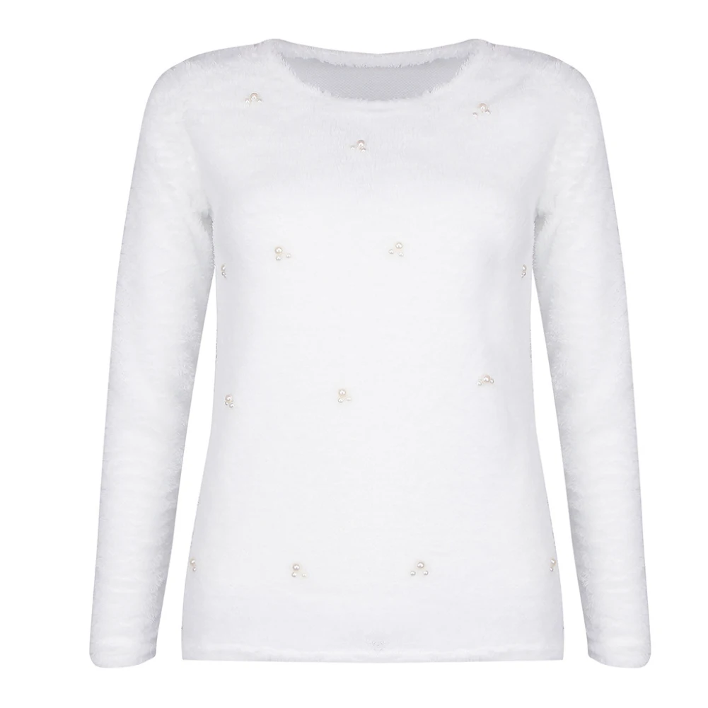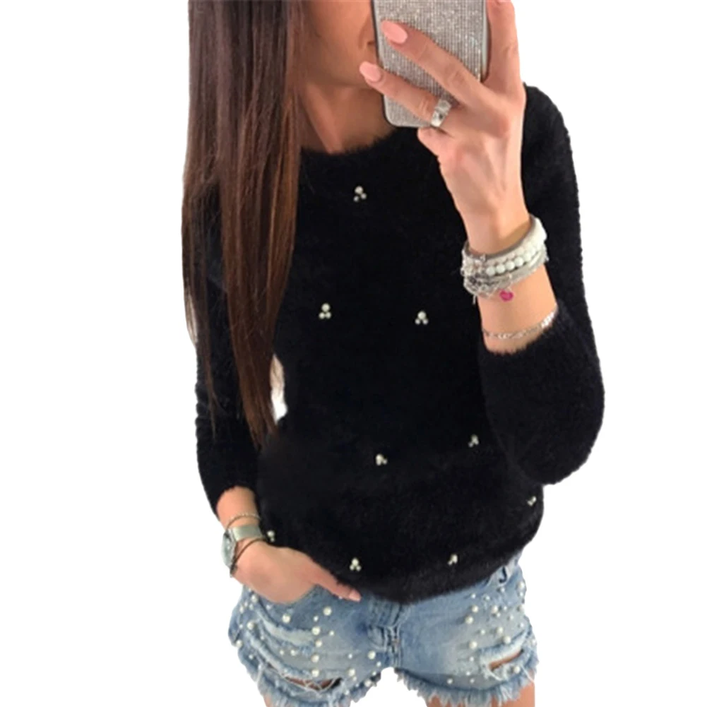 Зимний женский модный однотонный плюшевый пуловер с длинными рукавами с искусственным жемчугом и бусинами