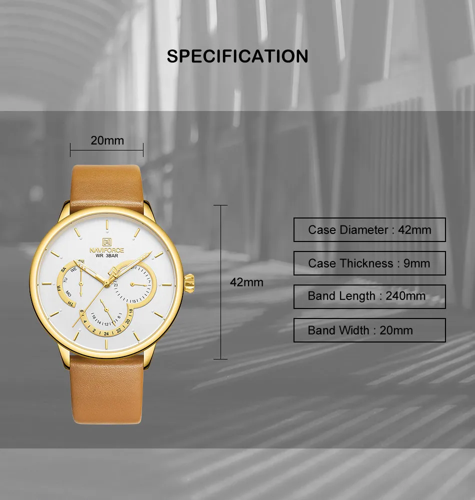 Description 100% New with tag and high quality Fashion Simple Creative Men's watch Water resistant (Washing Hand) Date Week and Hours display Higher Quality Leather Watch Band Specifications Case Material: Alloy Case Diameter: 42mm Case Thickness: 9mm Band Material: leather strap Band Length: 240mm (Cse Included) Band Width: 20mm Weight : 42g