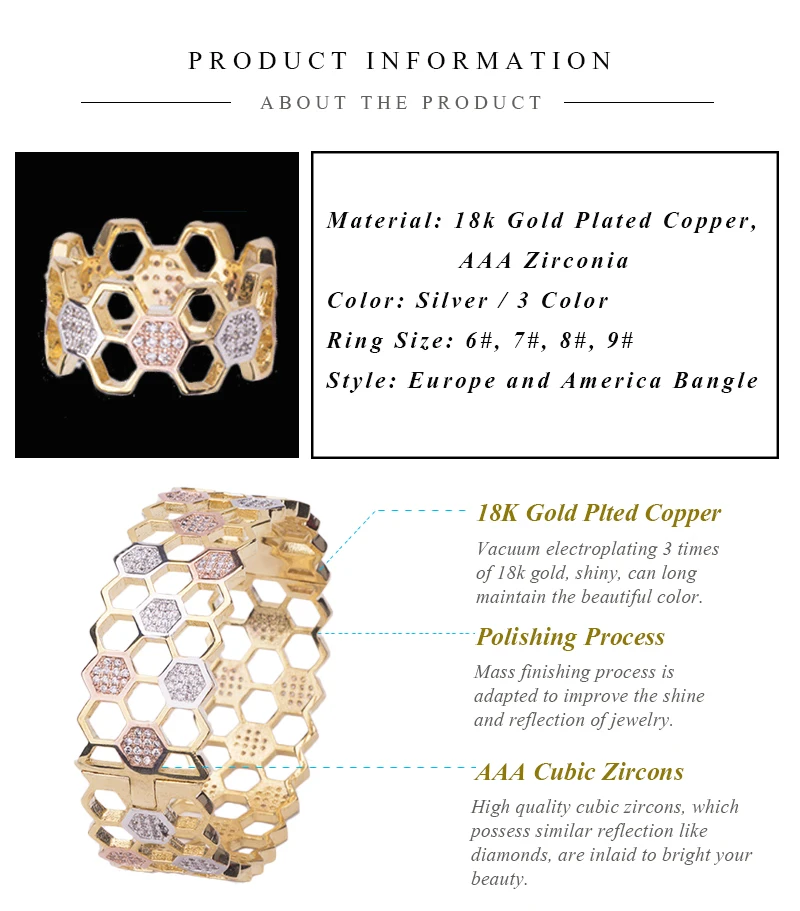 Окружность всех цветных браслетов составляет 17 см 100% Фирменная Новинка Стиль: браслет и кольцо комплект ювелирных изделий Материал: Позолота 18 K медь, кубические цирконы AAA Цвет: Белое золото/розовое золото Размер браслета и браслета: 52*58 мм Размер кольца: 6 #, 7 #, 8 #, 9 # Носить Повод: Свадьба, юбилей, вечерние, выпускной, подарок, офис, помолвка Подарок для: подруги, жены, мамы, дочери, подруги, себя, ее Подходит для: молодых и зрелых женщин