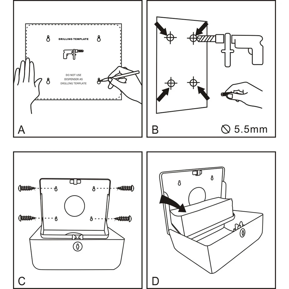 Диспенсер для туалетной бумаги изготовлен из нового и хорошего качества ABS, который имеет легкий вес, но прочный, компактный и гладкий вид. Он оснащен нужными аксессуарами и очень прост в установке. Он вмещает до 200 шт бумажных полотенец и хорошо работает, сохраняя ваш счетчик поверхности беспорядок. Идеально подходит для отеля, торгового центра, офисного здания, ванной комнаты, туалета, школы, детского сада, банка и других общественных мест.