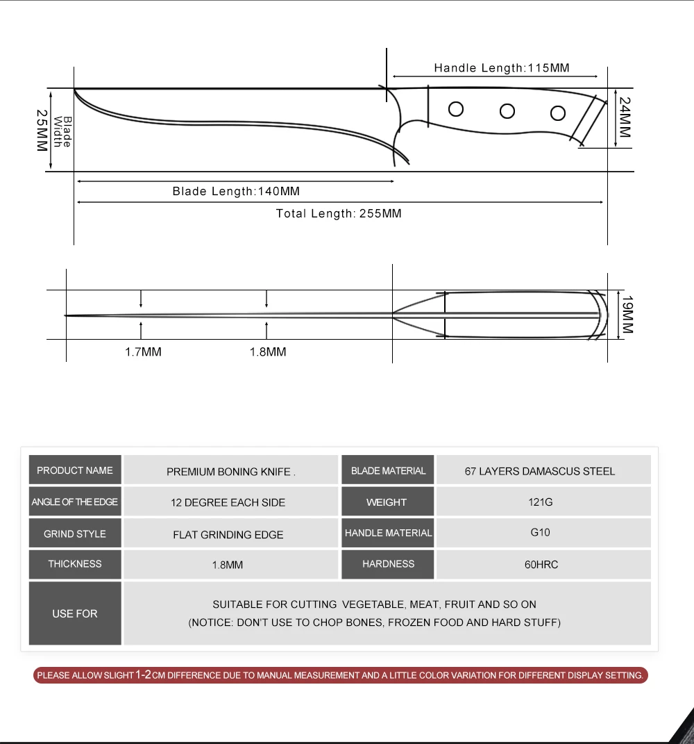 Длина: 255 ммДлина лезвия: 140 ммТолщина: 1,8 мм.Изготовлен из 67-слой дамасской Сталь импортируется из Японии. VG-10 стальной режущий сердечник;