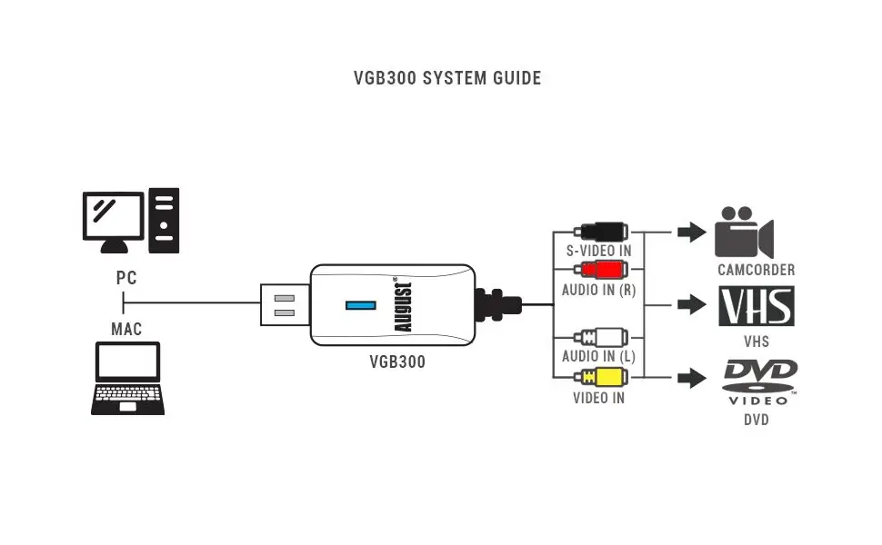 Цифровизация аналоговых видео: можно конвертировать практически все аналоговые видео в цифровую формату при использовании August VGB300. А также, можно сохраните бесценные вспоминания на жестком диске компьютера.
