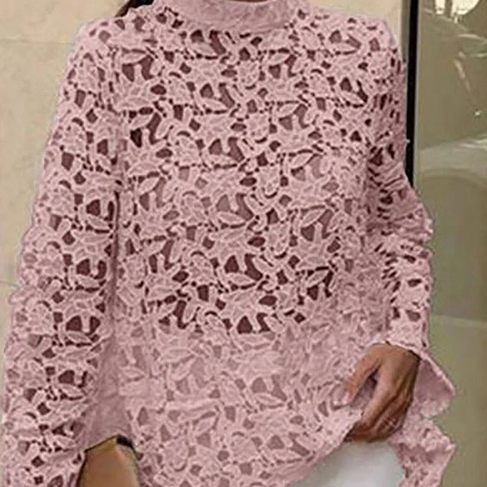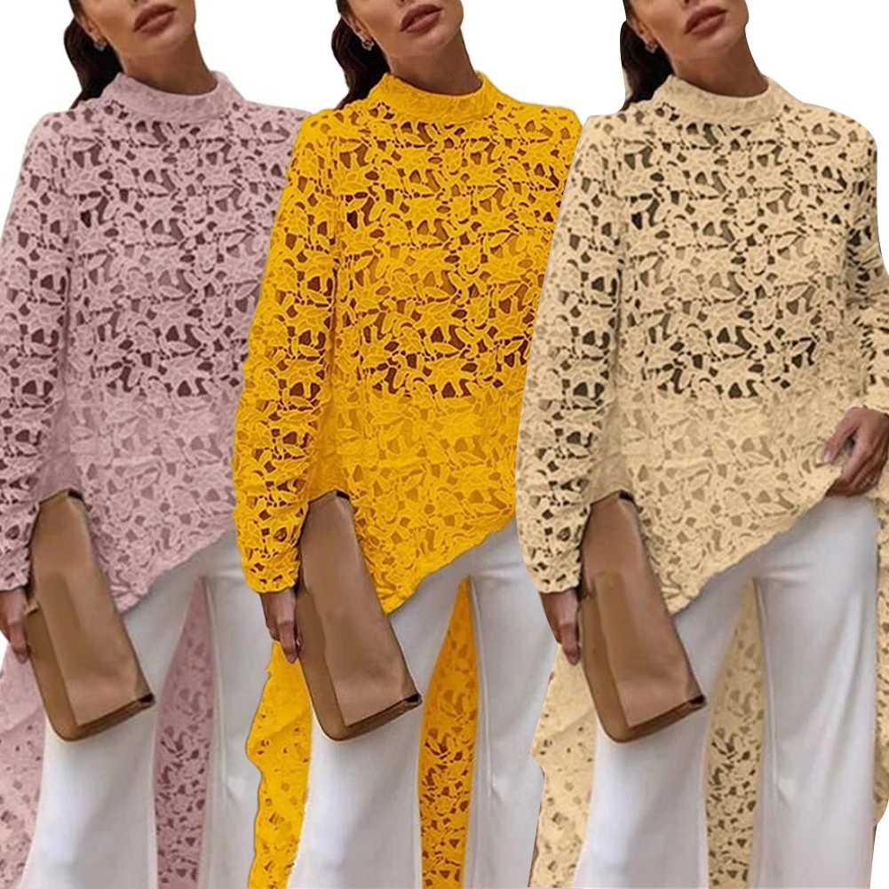 Весенне-осенняя модная женская однотонная ажурная кружевная блузка с высоким низким верхом
