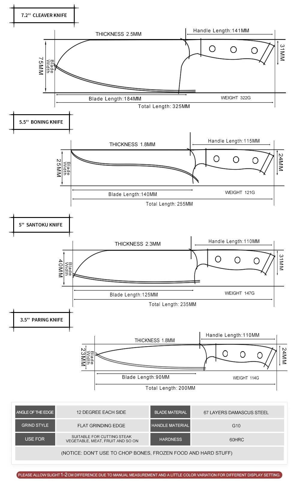 3,5 дюймов нож для очистки овощей Ножи:Длина: 200 ммДлина лезвия: 90 ммШирина лезвия: 23 ммТолщина: 1,8 мм.Изготовлен из 67-слой дамасской Сталь импортируется из Японии. VG-10 стальной режущий сердечник;