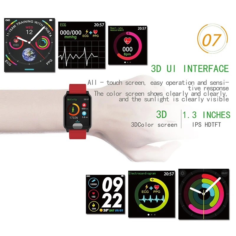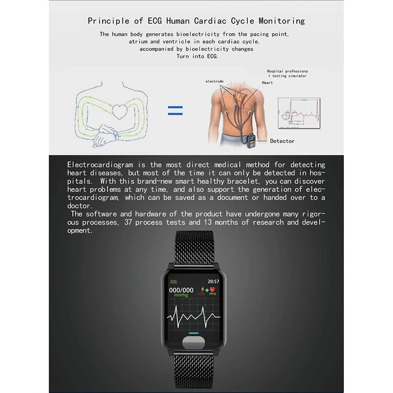 ЭКГ + PPG в сочетании для проверки сердечной функции электрокардиограммы. Сердечной функции 。 Защита окружающей среды ТПУ ремешок для часов, стикер руки не чувствовать себя носить. Функция двигателя: Шаг/калории/расстояние, мульти режим движения. Мониторинг сердечного ритма, мониторинг артериального давления и другие функции здоровья Пульт дистанционного управления функция заботы о Сервис Wearbale Hardward + SmartA pp + Big Data Clound Носите эти умные часы в любое время. Throught приложение управления, дисплей, запись данных. Данные будут синхронизироваться с приложением и клоунд севайс. Эти умные часы могут контролировать здоровье нашего тела. Это может находить и обнаруживать наши данные о состоянии здоровья, отображать статус риска и результаты оценки Долгое время работы от аккумулятора, 7-15 дней использования