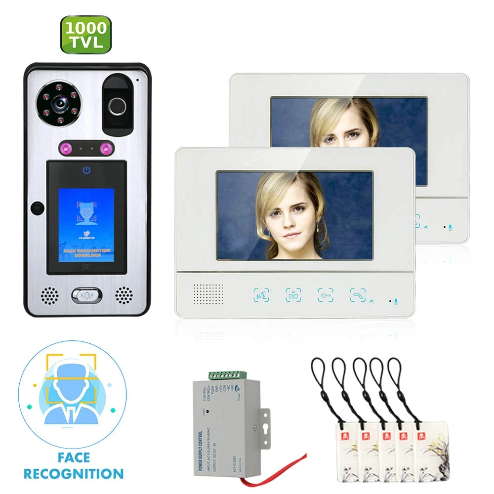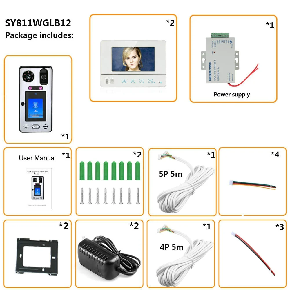 2 * Крытый монитор 1 * наружный блок (камера с распознаванием лица) 2*15V 1.2A Питание 1*12V 3A источник питания с контролем доступа 1 * 4-ядерный провод с клеммой сечением (5 м) 1 * 5-жильный клеммный провод (5 м) 5 * IC карты 3 * разблокировка провода терминала 1 * Руководство пользователя 2 * Монтажная пластина 1 * винты 1 * Цвет посылка