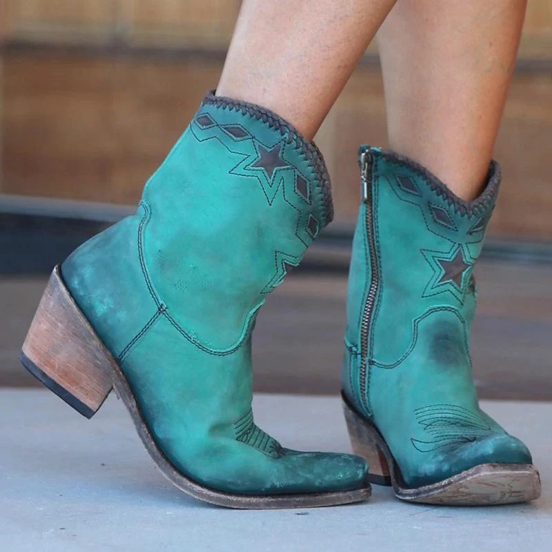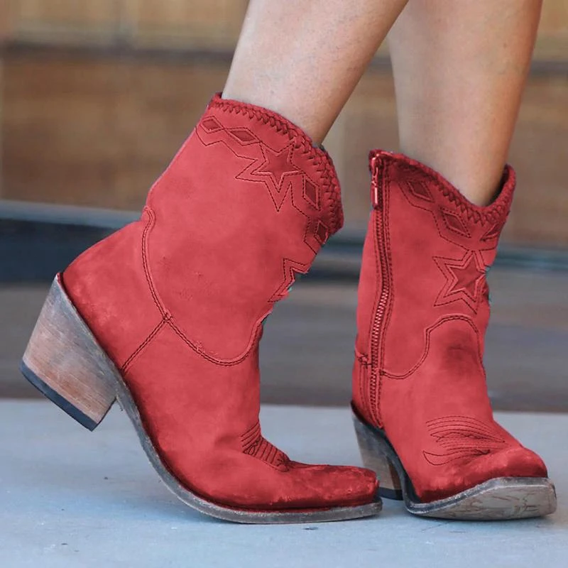 Женские Модные ботильоны в стиле ретро; ботинки из искусственной кожи на среднем каблуке с острым носком в западном стиле; Новинка 2019 года; однотонные ботинки с вышитым узором; Botas Mujer