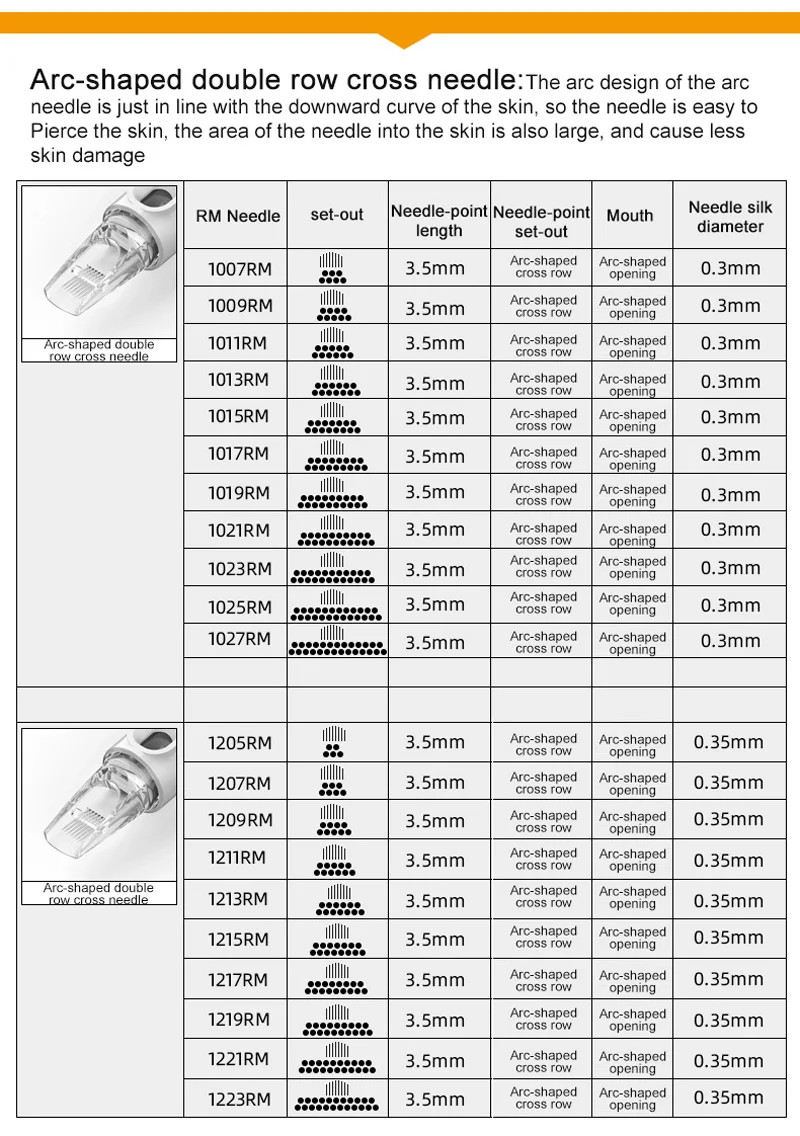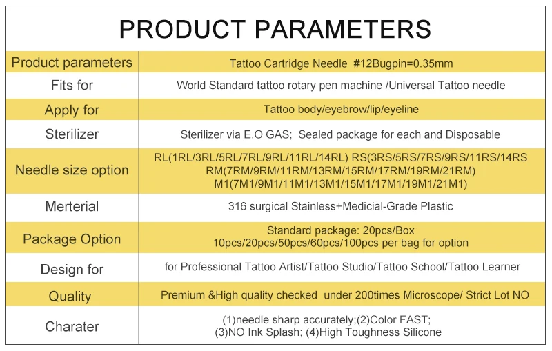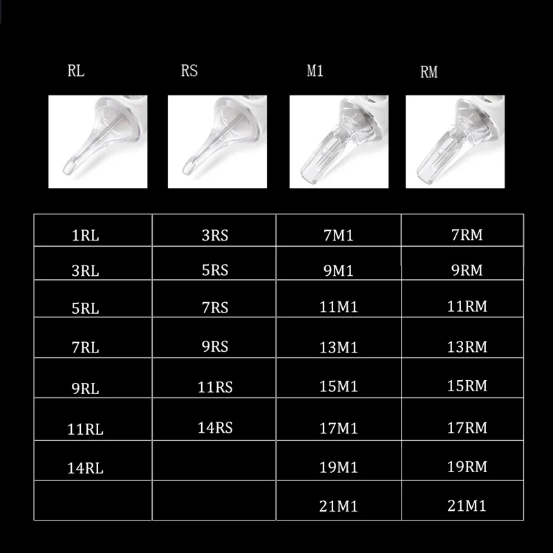 1. Иглы для татуировок изготовлены из точной формы, с низким уровнем шума, это поможет профессиональному татуировщику. 2. RL/RM/M1/RS четыре дополнительных типа с несколькими размерами будут соответствовать различным иглы татуировки. 3. Более того, одноразовый материал быстро изменяется и обеспечивает идеальную, несложную и гигиеническую работу.