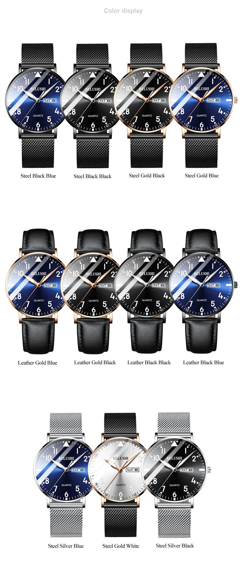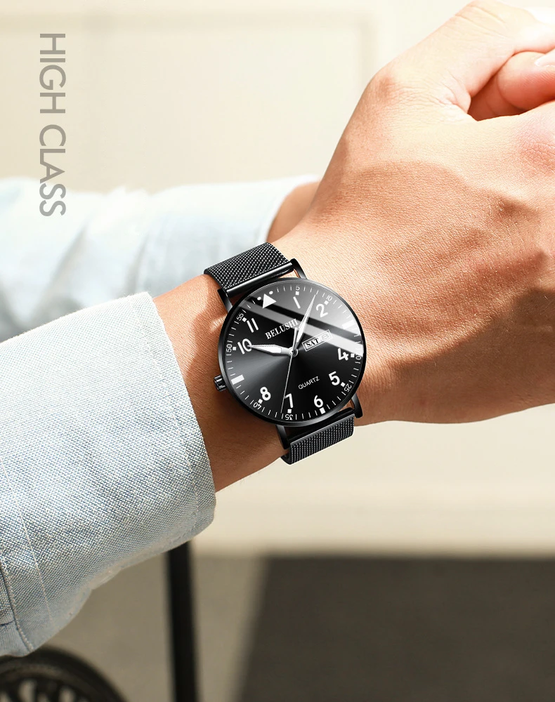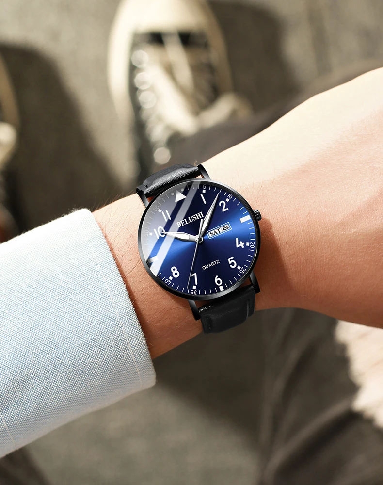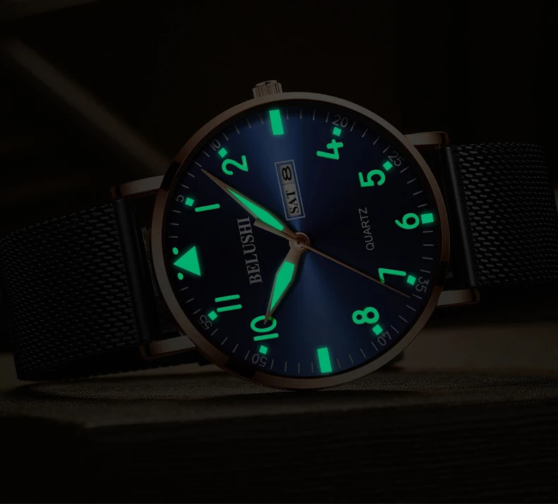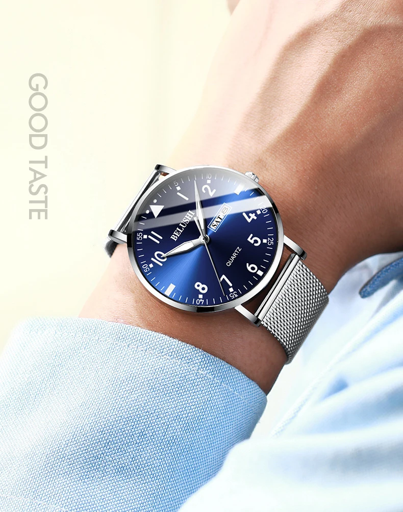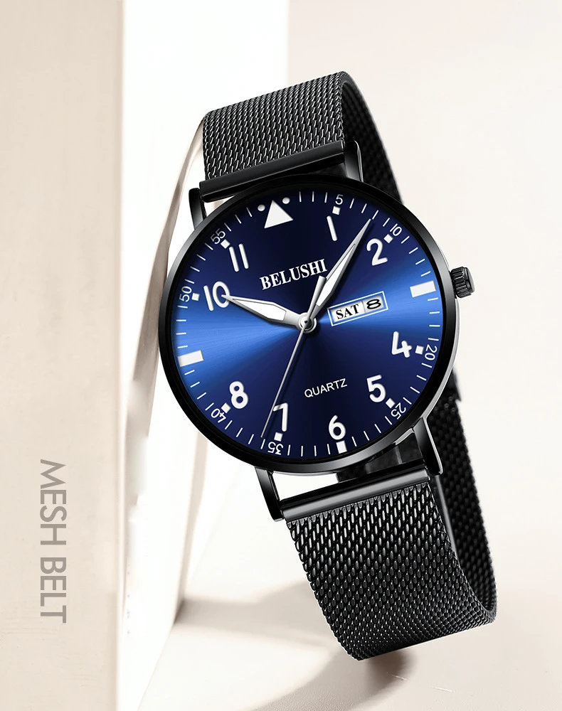 Бренд: BELUSHI Особенности: Простой деловой, Ультратонкий чехол Функция: Дисплей 12 часов, календарь даты, дисплей недели, водонепроницаемость 30 м Материал корпуса: нержавеющая сталь Чехол Цвет на выбор: черный, золотистый, серебристый, Цвет циферблата: синий, черный, белый Материал ремешка: стальная сетка, натуральная кожа Механизм: кварцевый аккумулятор Водонепроницаемость: 30 м Водонепроницаемость (пожалуйста, не замачивайте в воде) Размер Диаметр циферблата: около 40,5 мм Циферблат Толщина: около 8,6 мм Ширина ремешка: около 22 мм Длина ремешка: около 24 см Посылка: часы-1 шт.