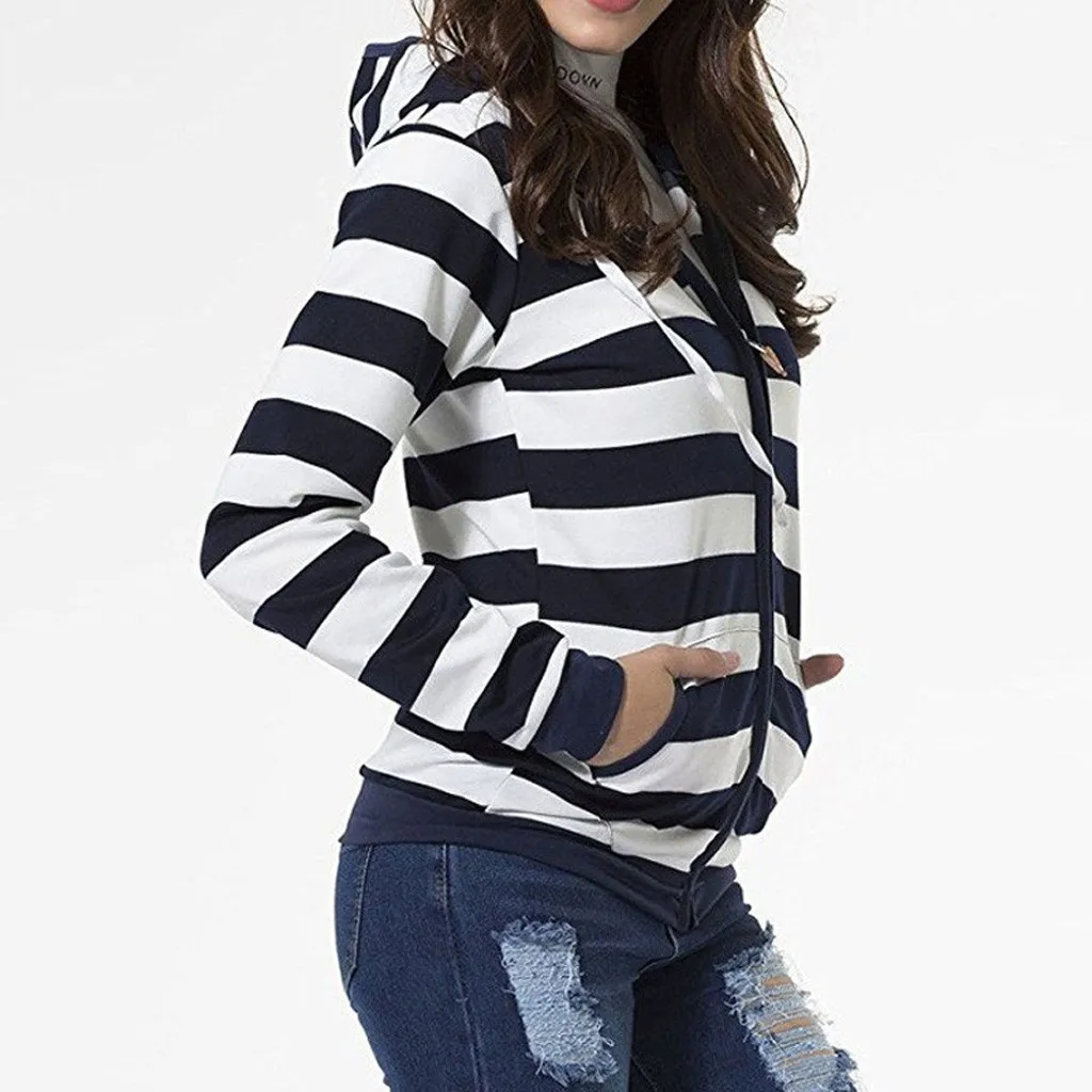 Women Casual Stripe Print Zipper Outerwear Hooded Sweatshirt Jacket Slim Coats