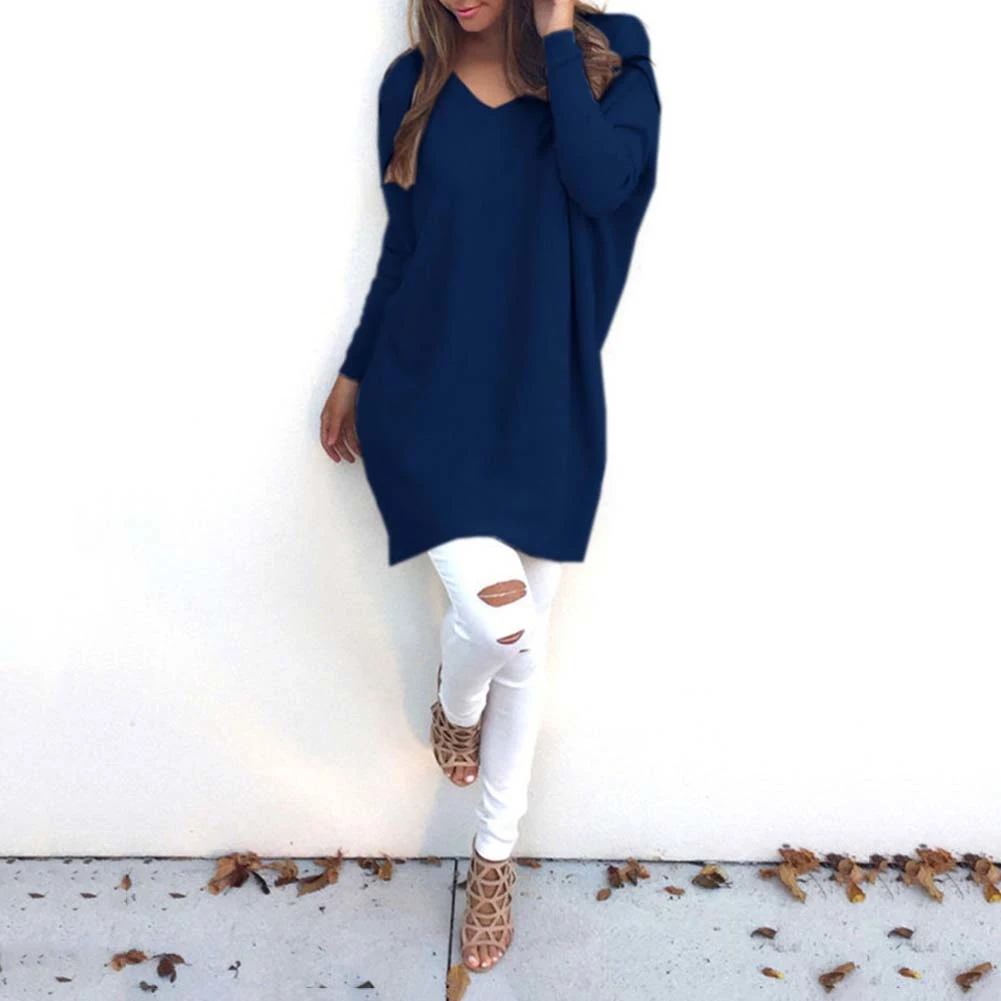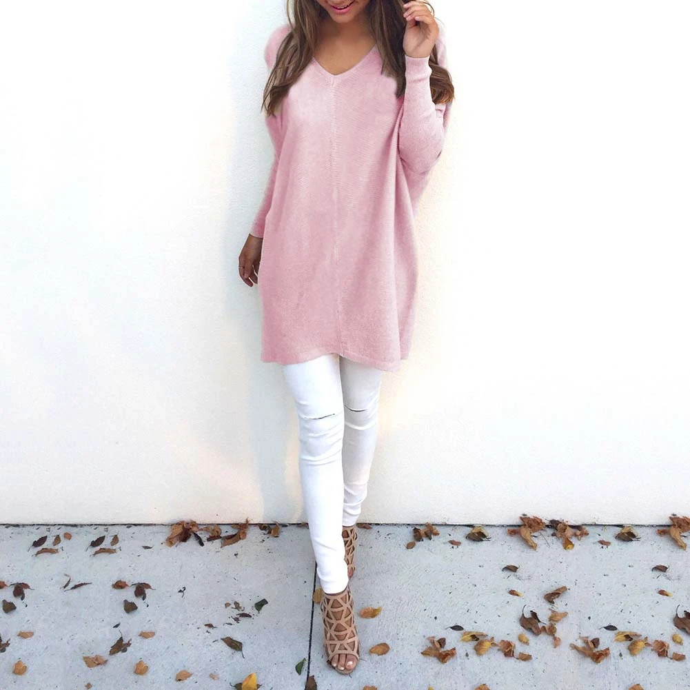 Модный женский свитер с v-образным вырезом, длинный рукав, туника-пуловер, свитера, повседневный Свободный вязаный свитер Одноцветный женский свитер, свитер