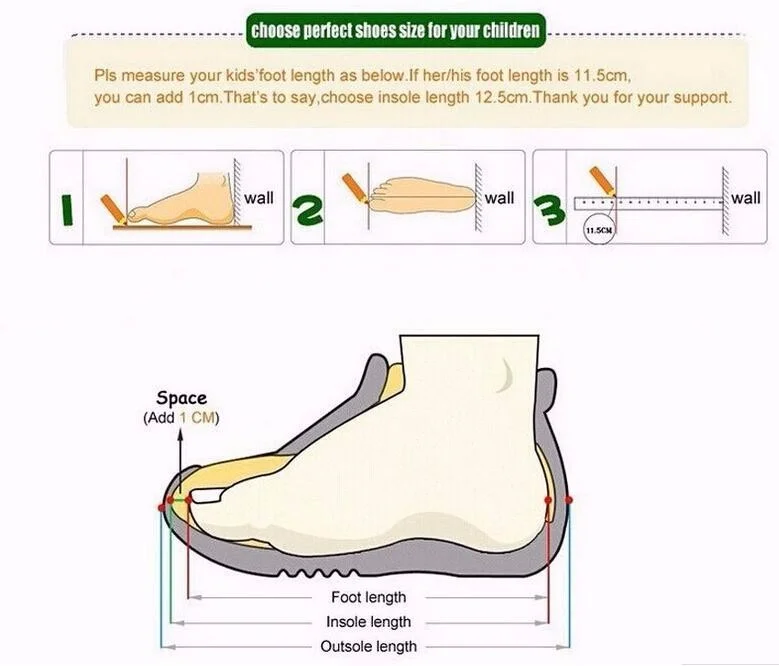 Дорогие друзья! В связи с тем, что размеры отличаются в каждой стране, пожалуйста, выберите правильный размер в соответствии со следующей формой, прежде чем размещать заказ с нашей детской обувью. (длина стельки (в см) = длина стопы + 0,5 ~ 1 см) Из-за роста ребенка и длительного времени доставки из Китая, больший размер лучше для вашего выбора. Пожалуйста, обратите внимание, что вся обувь поставляется с пузырьковыми пакетами, спасибо!