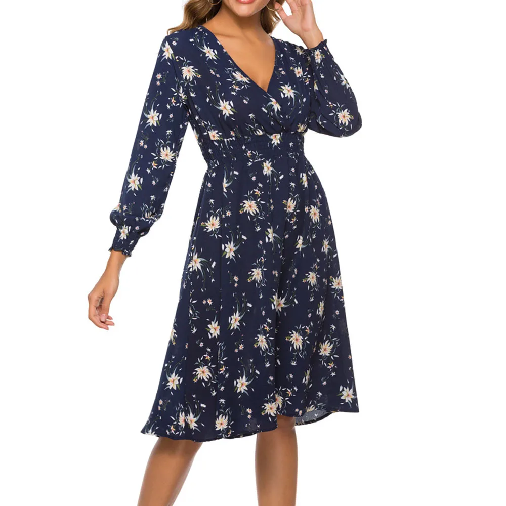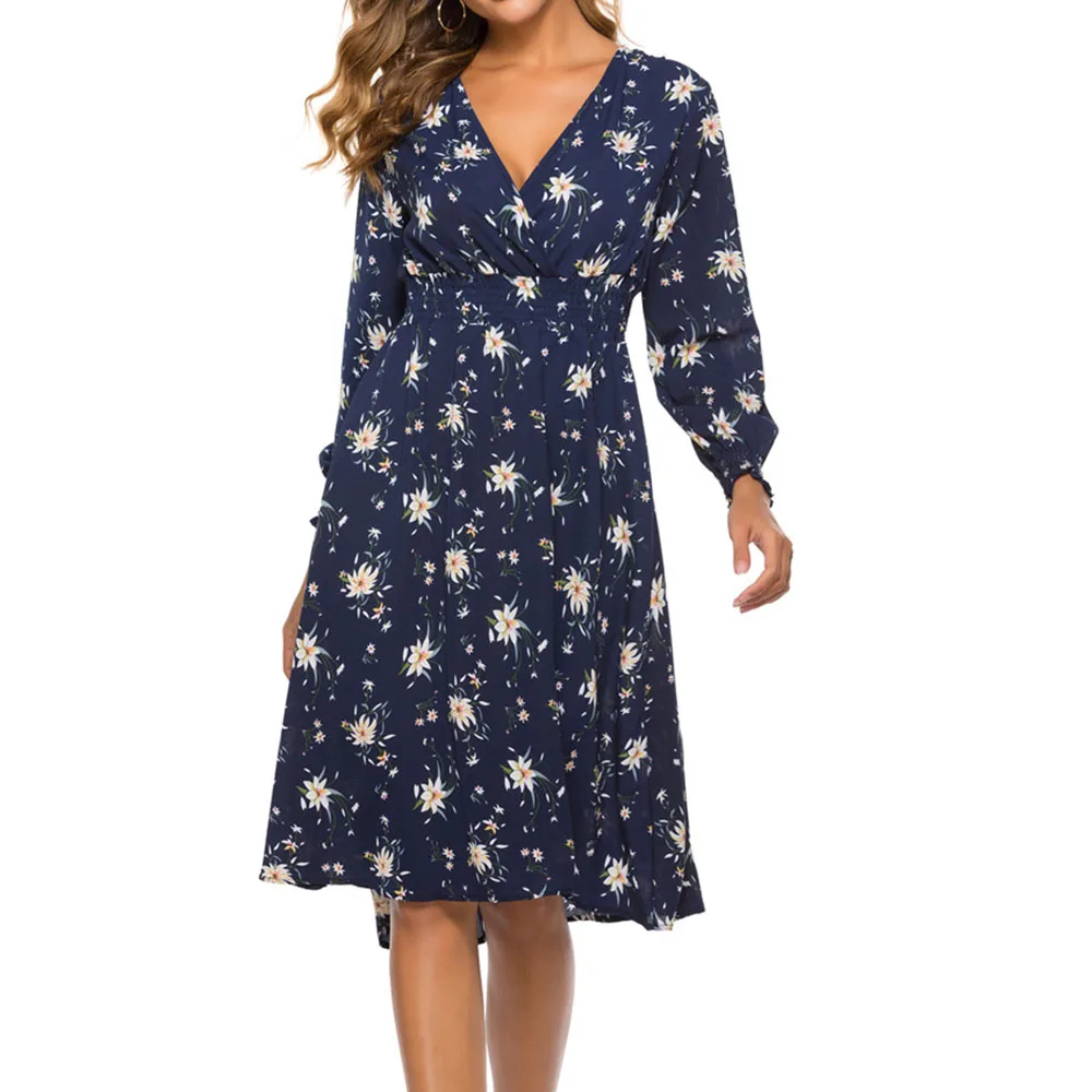 Осеннее женское платье с длинным рукавом и v-образным вырезом, повседневное элегантное сексуальное шифоновое платье с цветочным принтом для женщин, Roupa Feminina Ropa Mujer Vestidos