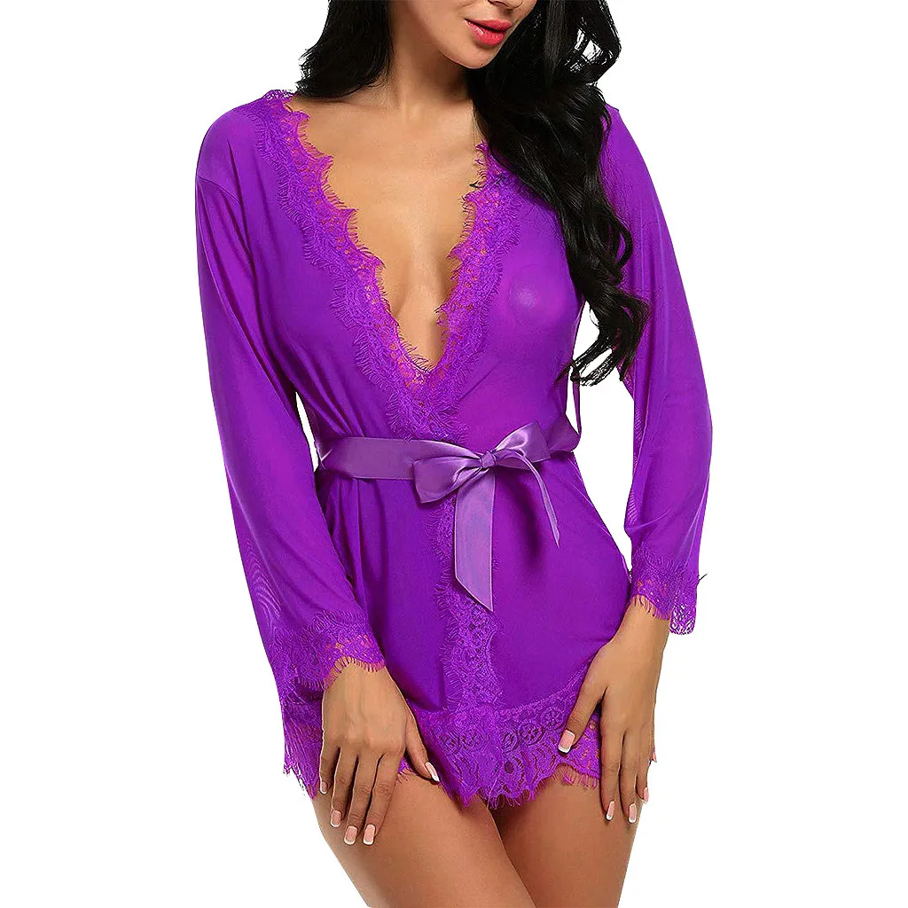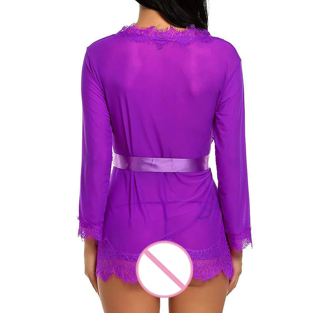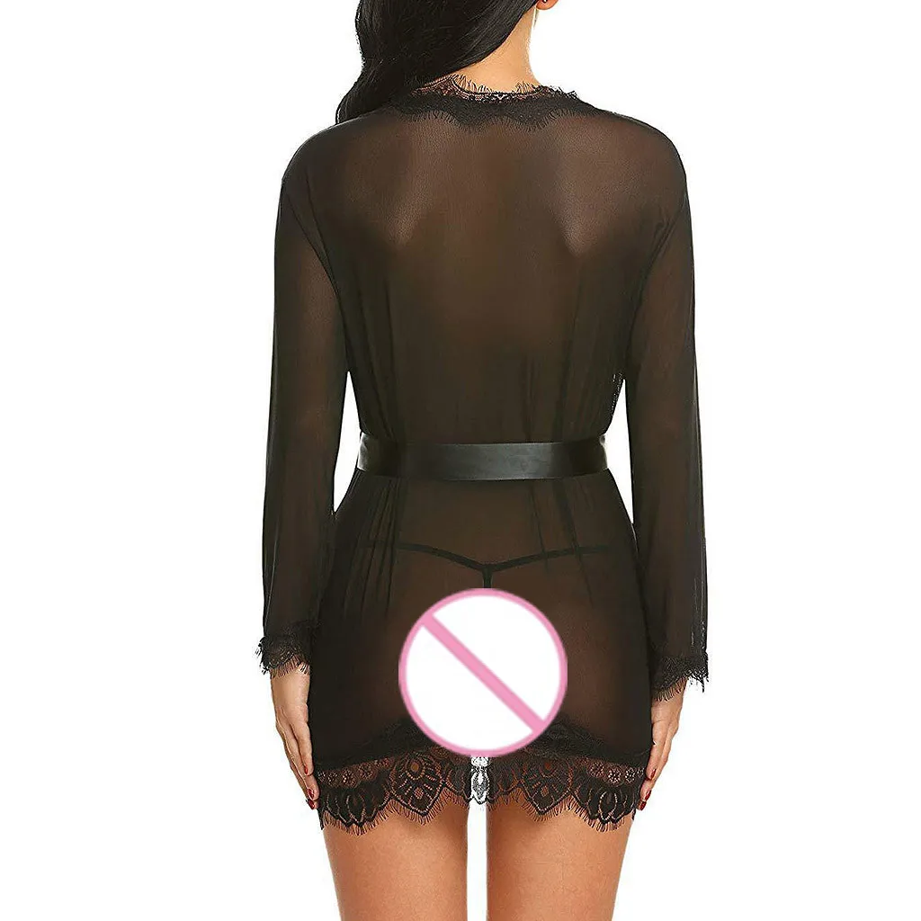 Женская сексуальная простая Сексуальная Ночная сорочка с v-образным вырезом, ночная сорочка, нижнее белье, Кукольное Белье для сна, сетчатый халат с поясом, 2019