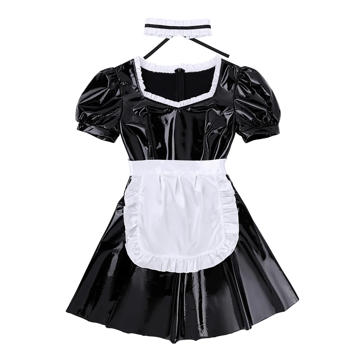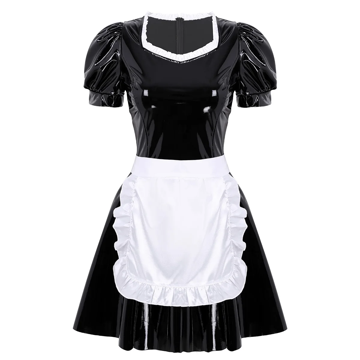 Женский взрослый мокрого вида французская Униформа горничной косплей костюм платье, скрытая молния сзади застежка.