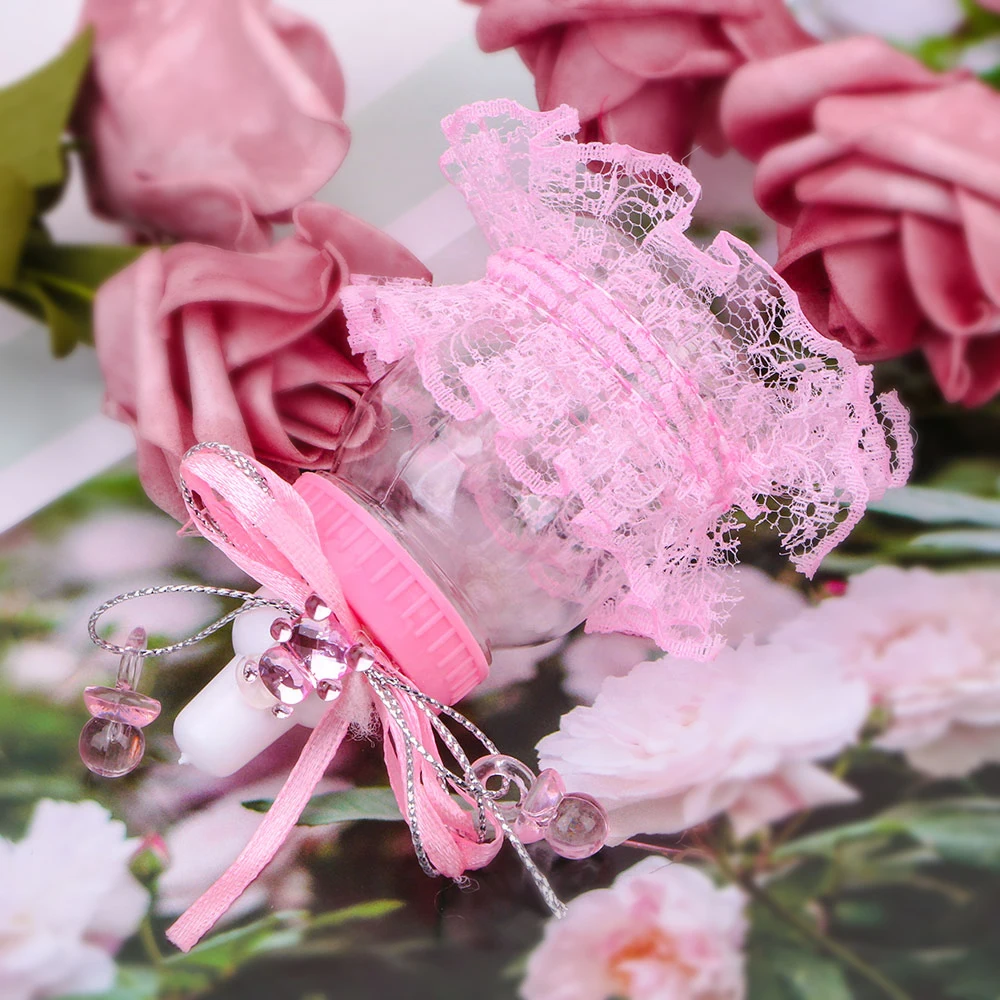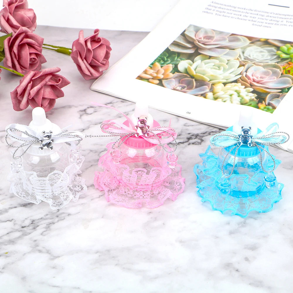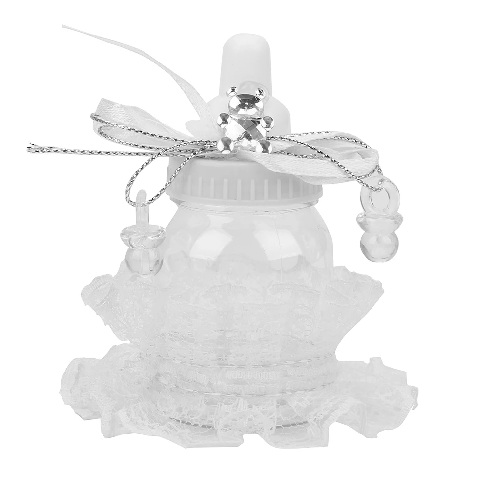 Дизайн бутылочки для кормления, с красивым бантом, хрустальным медведем и декоративными лентами, выглядит действительно мило, мило и деликатно.
