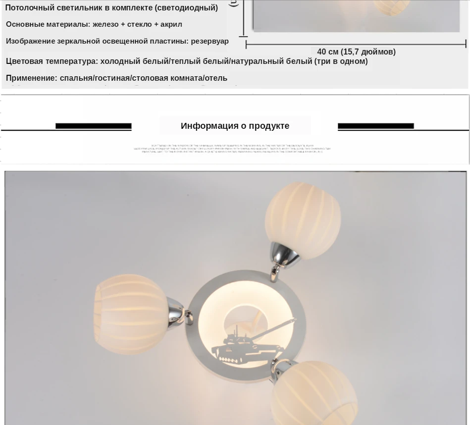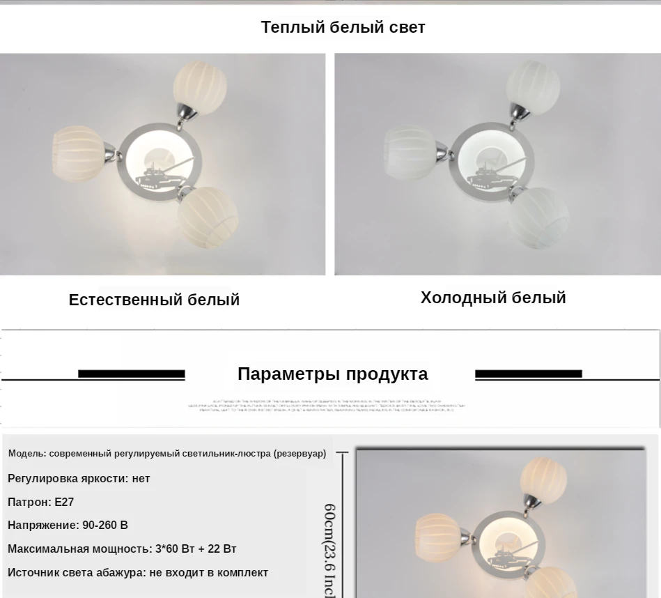 Модель: современный регулируемый светильник-люстра (резервуар) Размер: 40 см * 60 см (15,7 дюйма * 23,6 дюйма) Патрон: E27 Напряжение: 220 V Максимальная мощность: 3*60 Вт + 22 Вт Материал абажура: матовое стекло Акриловый светильник с рисунком панели: резервуар Абажур светильник источник: не входит в комплект Потолочный светильник источник: в комплекте (светодиодный чип) Цветовая температура: Холодный/теплый/натуральный белый (три в одном) Уважаемый, эта люстра имеет холодную/теплую/естественную белую 3 цветовую температуру, вы можете включить/выключить люстра, чтобы изменить цвет.