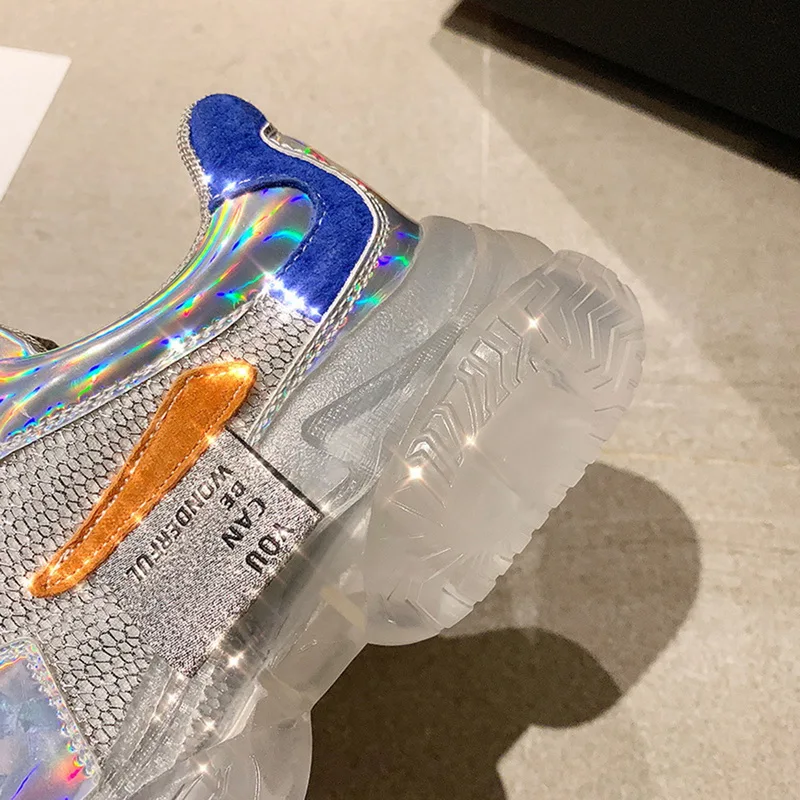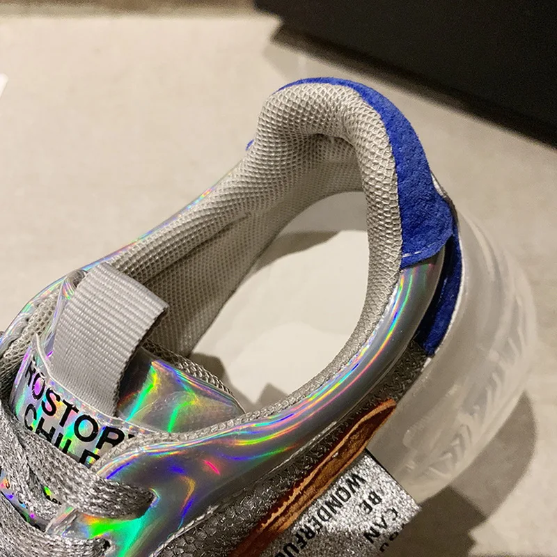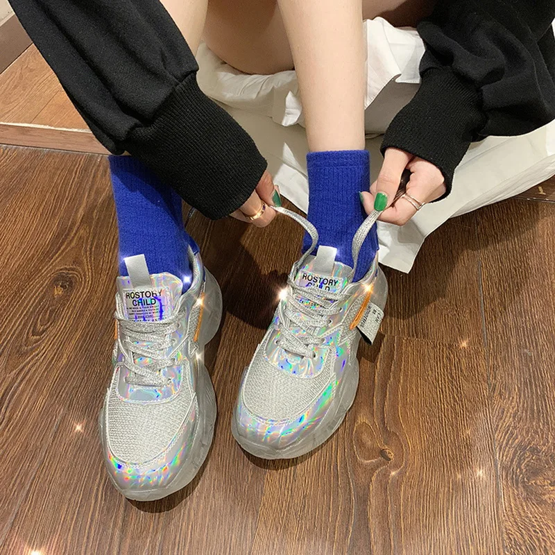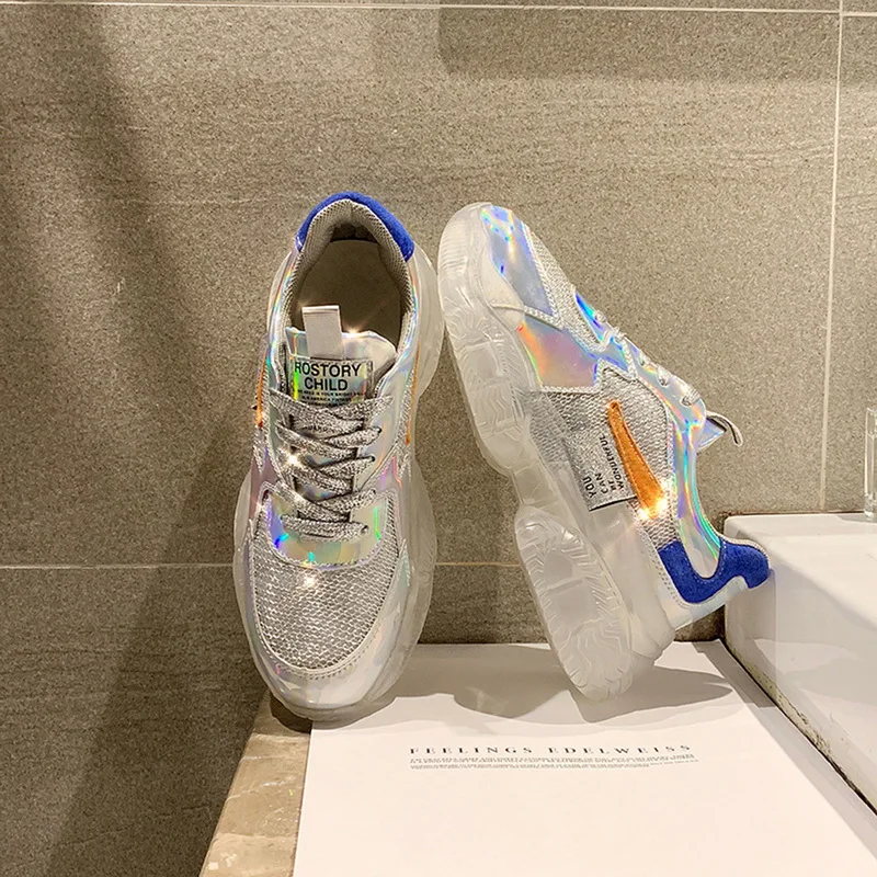 Женские легкие кроссовки; Новинка 2019 года; модная повседневная обувь на не сужающемся книзу массивном каблуке с лазерными кристаллами; женские сетчатые дышащие кроссовки для прогулок; спортивные кроссовки