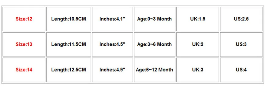 Размер: 12 дюймовДлина: 10,5 смДюйм (ов): 4,1"Возраст: 0-3 месяцаВеликобритания: 1,5Свяжитесь с нами: 2,5Размер: 13Длина: 11,5 смДюйм (ов): 4,5"Возраст: 3-6 месяцевВеликобритания: 2Свяжитесь с нами:3Размер:14Длина: 12,5 смДюйм (ов): 4,9"Возраст: 6-12 месяцевUK:3Свяжитесь с нами: 4