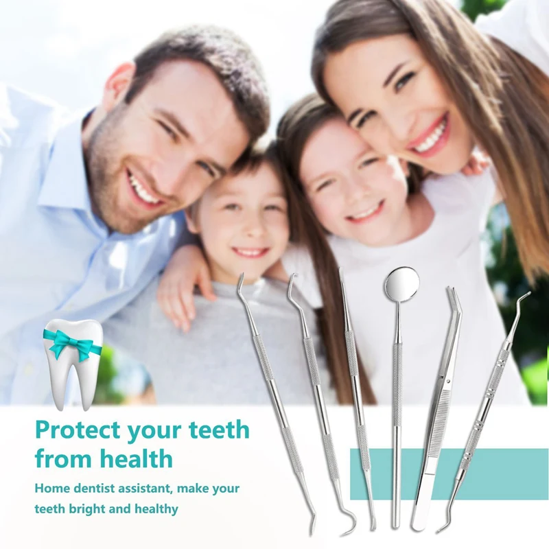 Удаление зубного налета: преимущества обычного ухода за зубами: 6 шт. Набор для гигиены зубов помогает предотвратить запах рта и удалить остатки зубного налета между зубами. Который удаляет пятна и обесцвечивание с поверхности ваших зубов, чтобы значительно отбелить и осветить вашу улыбку. Посвященная качеству и стилю, все Инструменты изготовлены с использованием высококачественной хирургической нержавеющей стали. Полностью sterilizable.