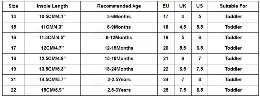 РазмерСтельки ДлинаРекомендуемый возрастЕСВеликобританияСвяжитесь с намиПодходит для1410,5 см/4,1"От 3 до 6 месяцев1745Для детей ясельного возраста1511 см/4,3"От 6 до 9 месяцев184,55,5Для детей ясельного возраста1611,5 см/4,5"9 to 12 months1956Для детей ясельного возраста1712 см/4,7"12-15Months205,56,5Для детей ясельного возраста1812,5 см/4,9"15-18Months2167Для детей ясельного возраста2014,5 см/5,1"2-2.5Years2478Для детей ясельного возраста2215 см/5,9"2,5, для возраста до 3 лет257,58,5Для детей ясельного возраста