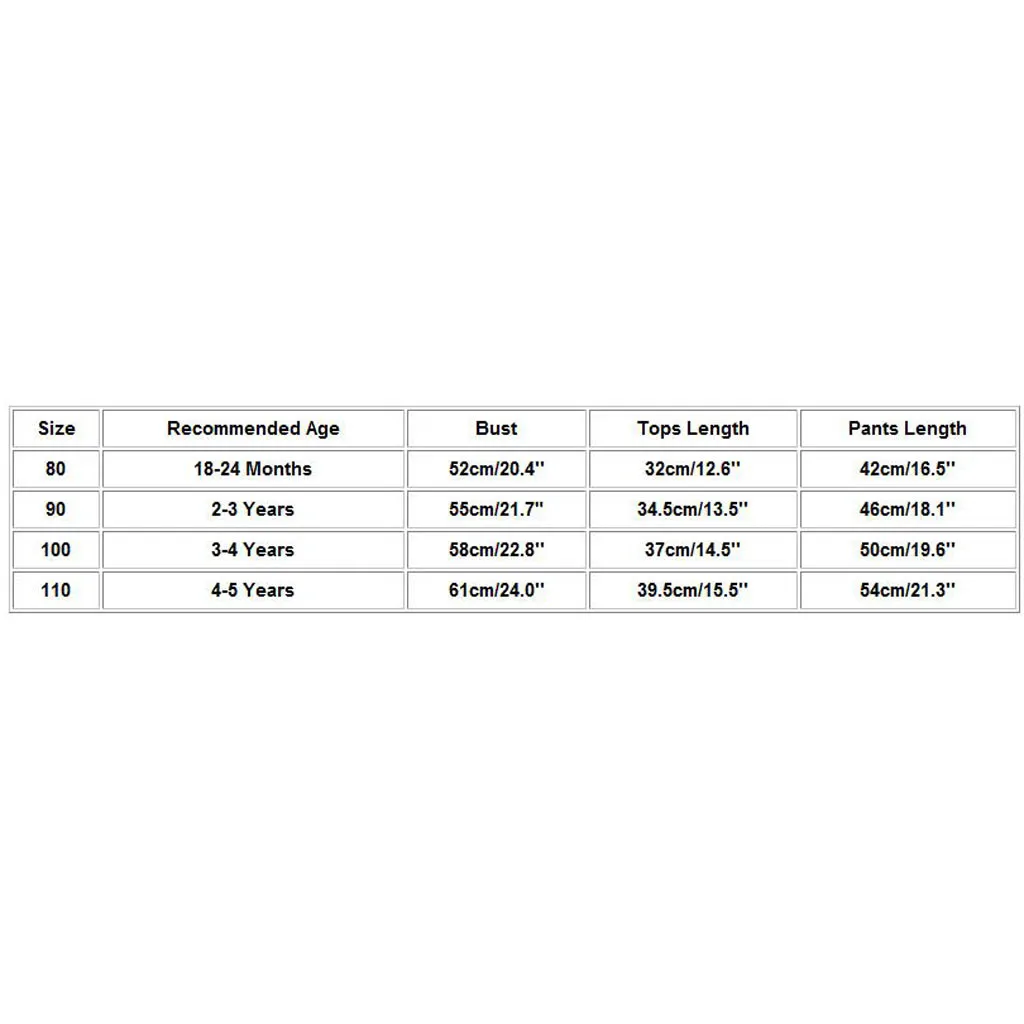 SizeRecommended AgeBustTops LengthPants Length8018-24 Months52cm/20.4''32cm/12.6''42cm/16.5''902-3 Years55cm/21.7"34.5cm/13.5''46cm/18.1''1003-4 Years58cm/22.8''37cm/14.5''50cm/19.6''1104-5 Years61cm/24.0''39.5cm/15.5''54cm/21.3''