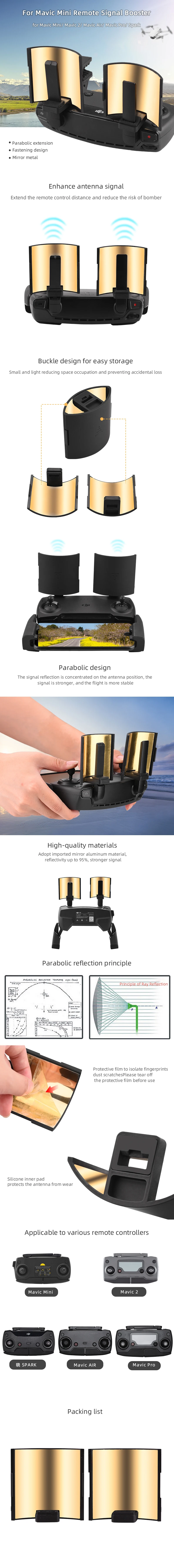 Особенности: 1. Положение карты постепенно спроектировано, не повреждая антенну дистанционного управления, 2. Независимые антенны, для установки, 3. Байонетная конструкция, 2 шт. можно пристегнуть, для переноски и хранения, 4. Защита пленки, защита от отпечатков пальцев, пыли, царапин, 5. Поверхность имеет специальный эффект, очень хороший отражающий эффект, улучшенный сигнал. Описание: Материал: Пластик, Применимые модели: для DJI Mavic Mini / Mavic 2 / Mavic Pro/ Mavic Air /Spark, Цвет: черный, зеленый, розовый Вес нетто: 26,2 г, Упаковочный лист: 2 шт. усилитель сигнала. Примечание: пульт дистанционного управления не входит в комплект.