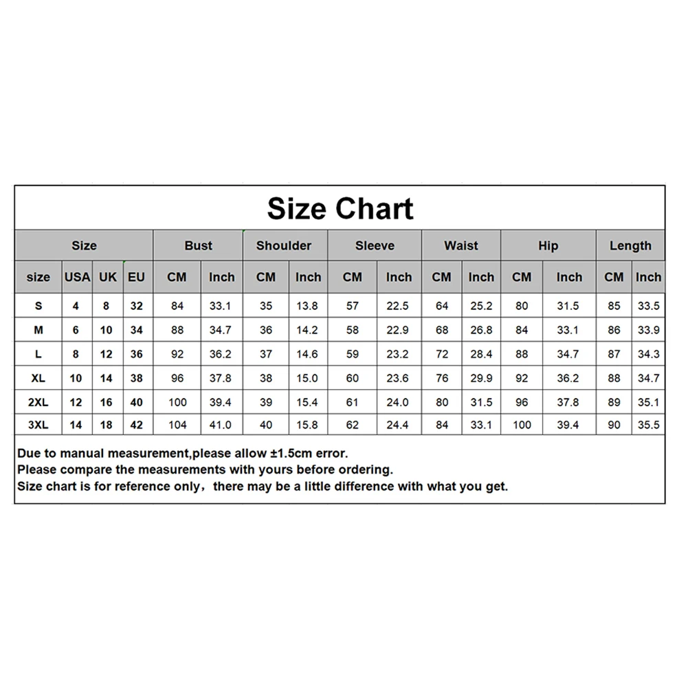 [Наш Размер 2XL] Обхват груди: 100 см/39,37 дюйма, обхват талии: 80 см/31,50 дюйма, обхват бедер: 96 см/37,80 дюйма, ширина плеч: 39 см/15,35 дюйма, длина рукава: 61 см/24,02 дюйма, длина: 89 см/35,04 дюйма (прибл.)