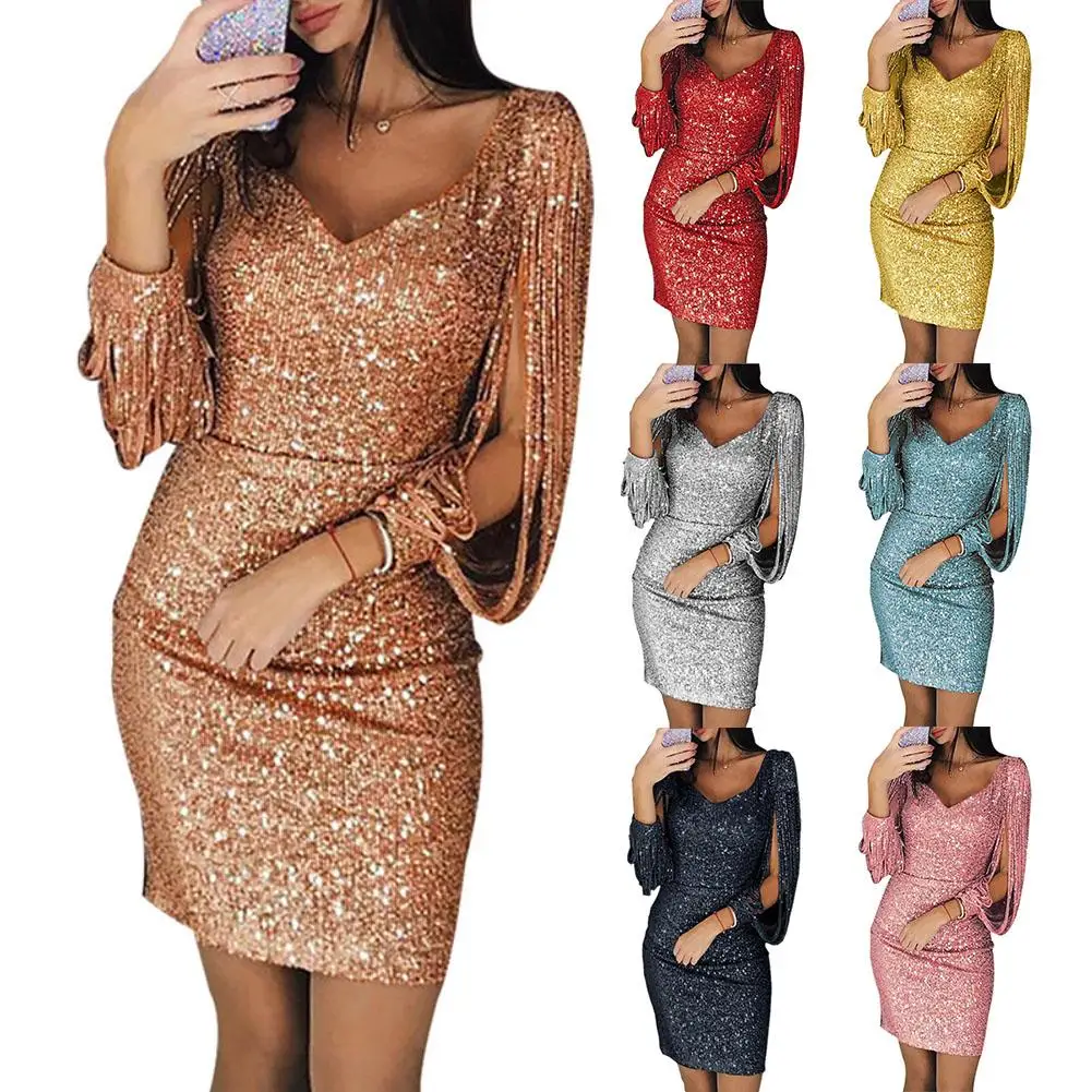 Вечерние мини-платья с блестками и v-образным вырезом, с кисточками и длинным рукавом