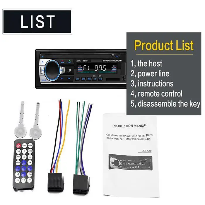 Посылка: 1 х Автомобильный Bluetooth MP3-плеер, 1 х пульт дистанционного управления, 1 х Руководство, 1 х Кабель питания, 1 х ключ для разборки