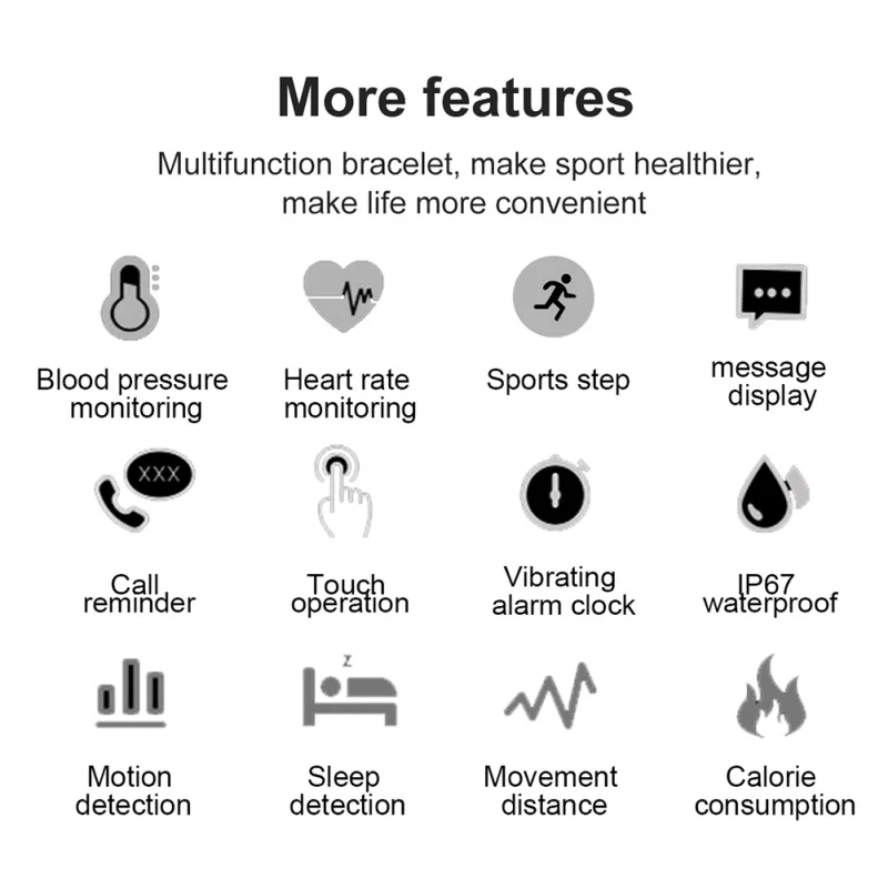 * Больше функций: количество шагов, пробег, калории, мониторинг сна, напоминание о сидячем положении, Поиск сотового телефона, движение WeChat, здоровое Обнаружение одним щелчком мыши