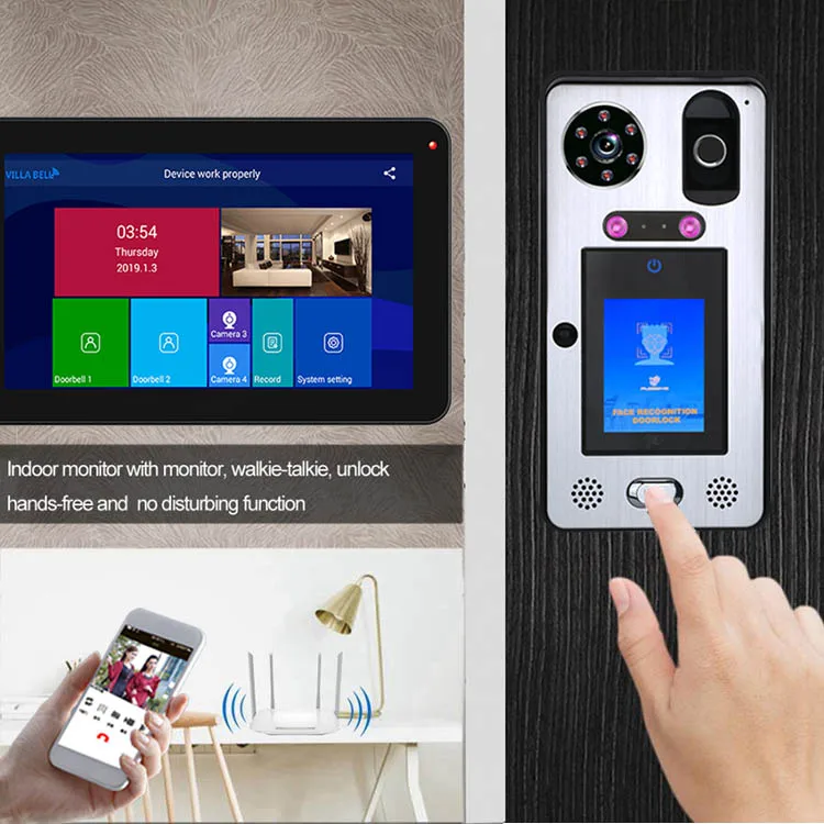 Простая установка самостоятельно с помощью адаптера и кабеля, которые мы предоставляем в этом комплекте, наружный блок может подключаться к крытому монитору с помощью проводного Кабеля 4P. Когда внутренний монитор подключен к беспроводному Wi-Fi роутеру, вы можете подключить мобильный телефон к крытому монитору, затем мобильный телефон также можете записывать видео или открывать дверь и т. Д. Широко используется в виллах, квартирах, дома, гостиницах, Офисы, общественные здания и так далее. 1. Внутренний монитор использует многоточечный емкостный сенсорный экран, принимает к системе Android, устойчивый и простой в эксплуатации. 2. 9 дюймов высокой четкости цифровой ЖК-дисплей монитор, с фотографией, посетителем записи и функцией календаря. 3. Внутренний монитор может фотографировать вручную или автоматически, максимум для поддержки 32G TF карты. 4. Внутренний монитор с монитором, Интерком, разблокировкой, громкой связью и функцией не беспокоить. 5. Внутренний монитор может поддерживать подключение 8 мобильный телефон пользователя приложения, поддерживает систему IOS/Android мобильный телефон, затем мобильный телефон может просматривать и разблокировать. 6. Наружный блок принимает 2,8 дюймовый сенсорный экран, высокая чувствительность. Всепогодная, антиокислительная, износостойкая алюминиевая панель, с защитой от атмосферных воздействий, поддержка настенного крепления, AHD 1080P камера, с IR-CUT. 7. Наружный блок поддерживает 100 шт. распознавание лица, 100 шт. отпечатков пальцев, 100 шт. отпечатков пальцев, 100 шт. IC пользовательской карты, 100 групповых паролей, внутренний монитор и мобильный телефон разблокировки приложения.