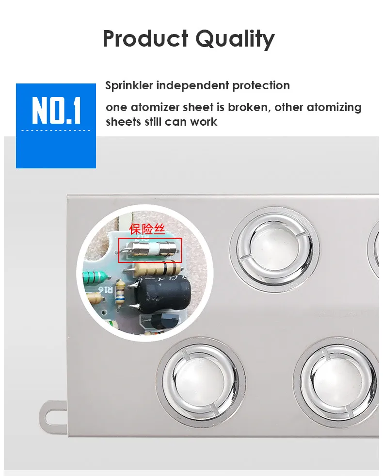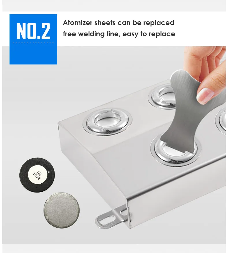 Название: атомайзер с 8 головками/10 головками Рабочая Напряжение: DC45V ± 3V Мощность: 200W Скорость Распыления: 5 кг/ч (8 герандов)-7 кг/ч (10 головок) Размер: 205*85*28 мм (8 палочек),253*85*28 мм (10 головок) Материал корпуса: нержавеющая сталь 304 Рабочая температура: 5-55 ℃ Давление воды: 0,01-0.2MPA