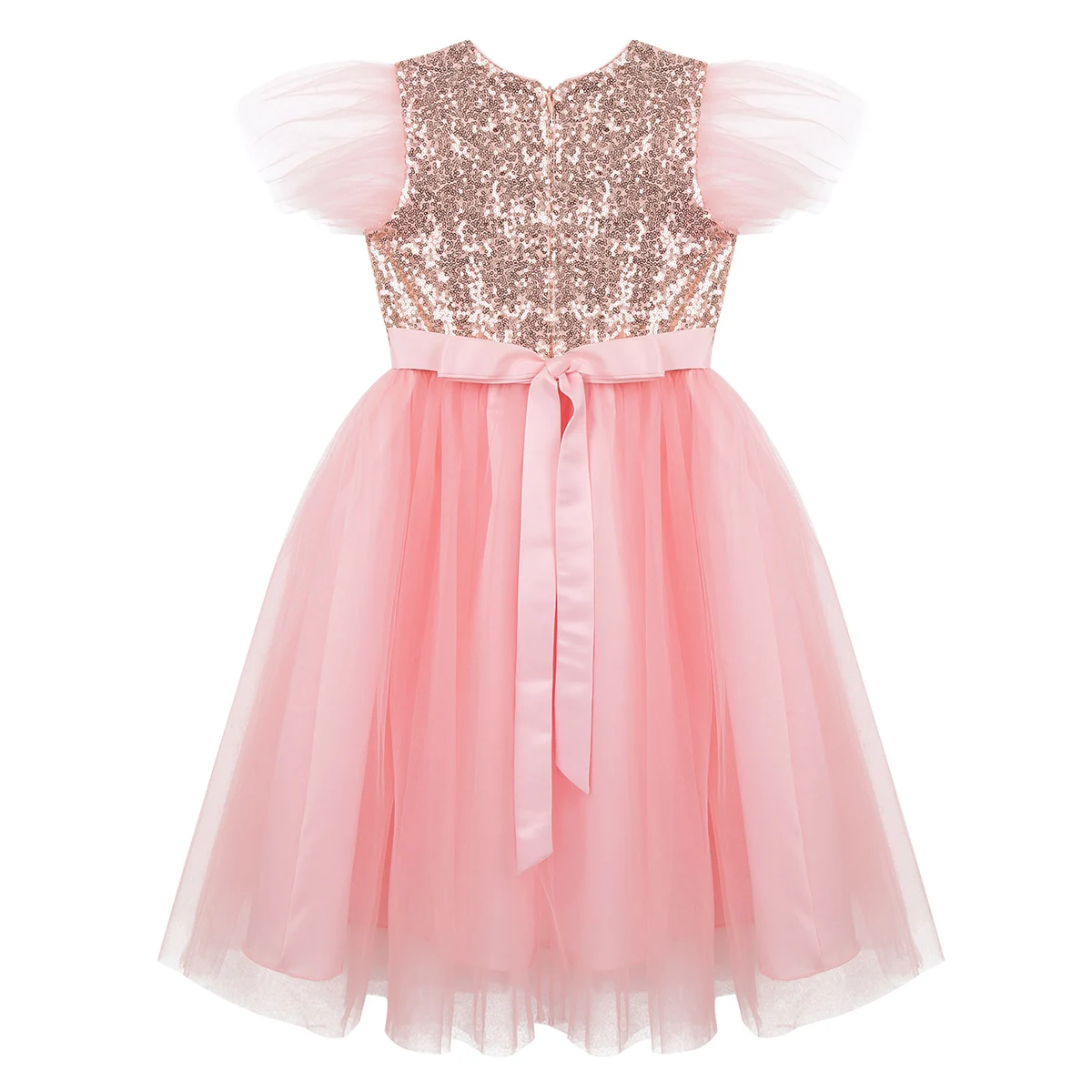 Сетчатые рукава, круглый вырез, лиф с блестками. Дизайн с высокой талией, пояс на спине.