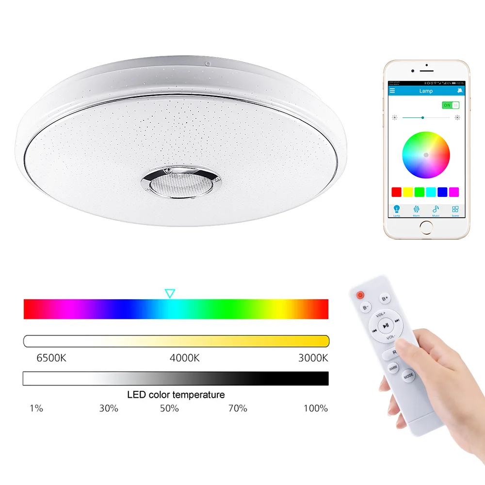 This LED full color bedroom ceiling light with Bluetooth speaker, 3-inch high-quality light-transparent full-range speaker with spring wire for easy installation.