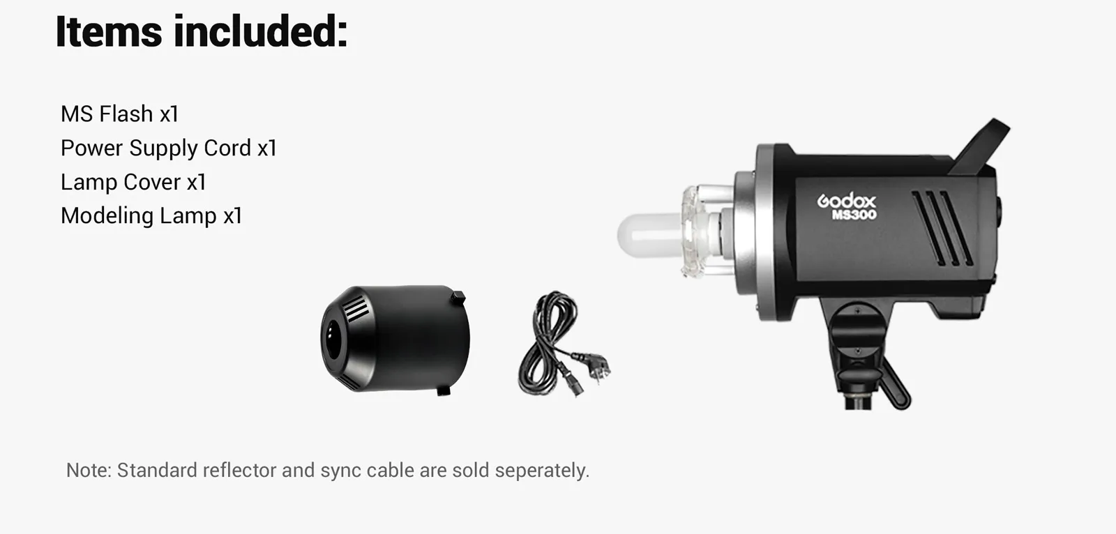 1x MS Flash 1x Шнур Питания 1x крышка лампы 1 лампа для моделирования Примечание: Стандартный отражатель и кабель синхронизации продаются отдельно