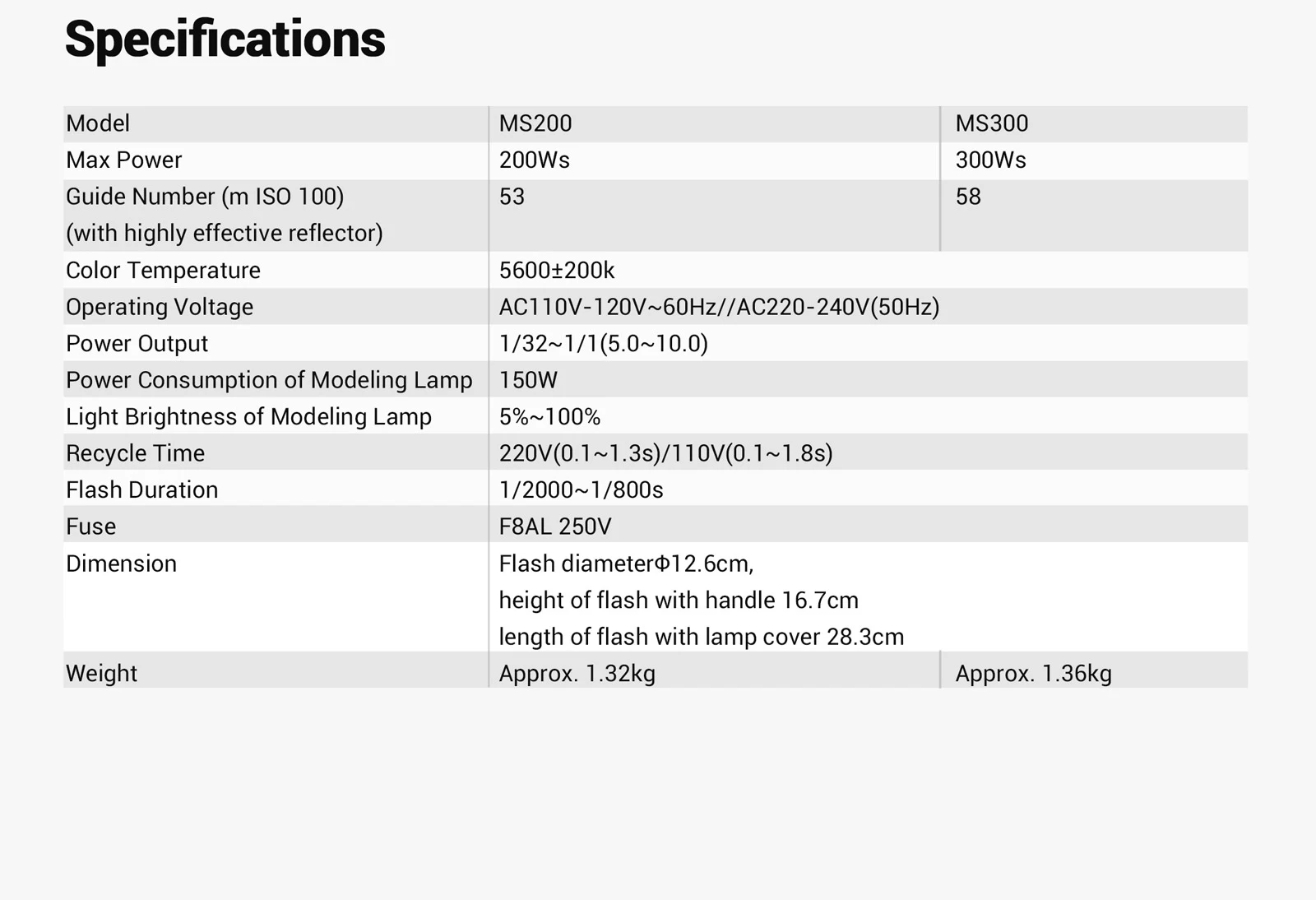 Модель: MS200/MS300 Максимальная мощность: MS200 200WS/MS300 300WS Направляющий номер (m ISO 100)(с высокоэффективным отражателем):MS200-53/MS300-58 Цветовая температура: 5600 ± 200k Рабочее напряжение: AC110V-120V-60Hz/AC220-240V(50 Гц) Выходная мощность: 1/32 ~ 1/1 (5,0 ~ 10,0) Потребляемая мощность модельной лампы: 150WS Светильник, яркость лампы моделирования: 5% ~ 100% Время рециркуляции: 220 В (0,1 ~ 1,3 с)/(110 В (0,1 ~ 1,8 с) Продолжительность вспышки: 1/2000 ~ 1/800s Предохранитель: F8AL 250V Размер: флэш-диаметр 12,6 см, высота вспышки с ручкой 16,7 см, длина вспышки с Абажур для лампы с металлическим каркаксом 28,3 см Вес нетто: около 2.6кг