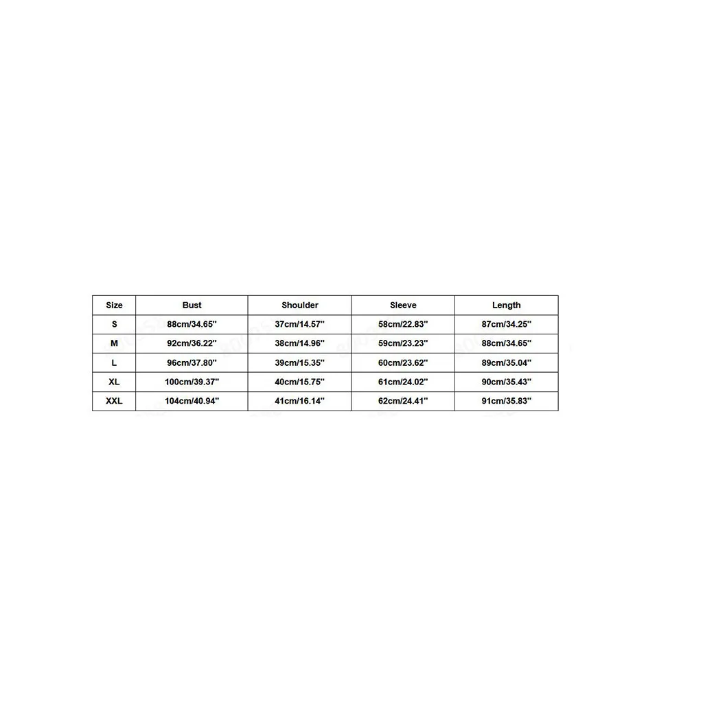 Размер Бюст Плечо Рукав Длина S 88 см/34,65'' 37 см/14,57'' 58 см/22,83'' 87 см/34,25'' М 92 см/36,22'' 38 см/14,96'' 59 см/23,23'' 88 см/34,65'' L 96 см/37,80'' 39 см/15,35'' 60 см/23,62'' 89 см/35,04'' XL 100 см/39,37'' 40 см/15,75'' 61 см/24,02'' 90 см/35,43'' XXL 104 см/40,94'' 41 см/16,14'' 62 см/24,41'' 91 см/35,83''