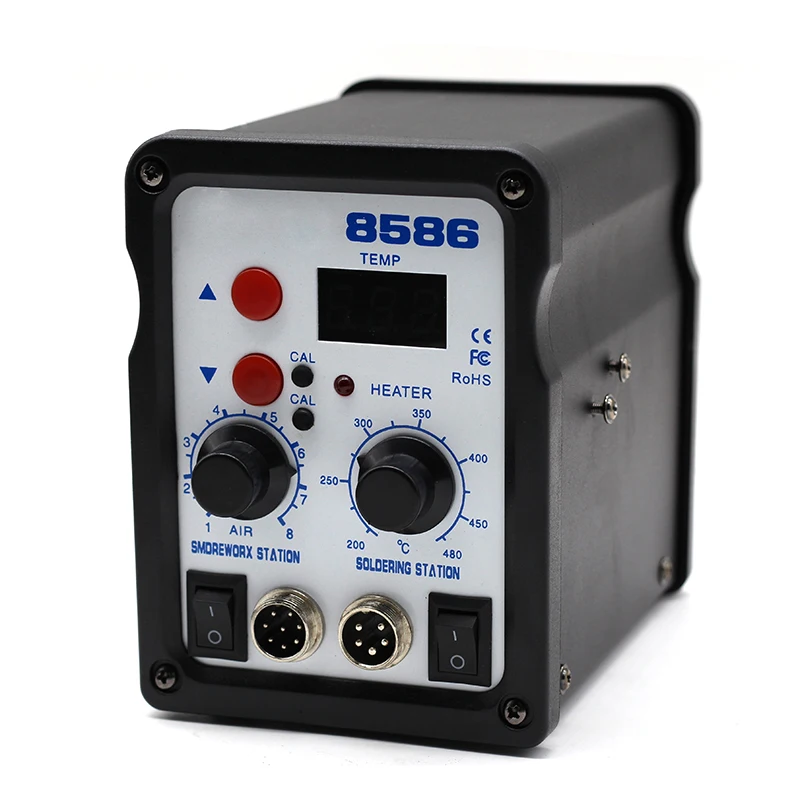 Это совершенно новая паяльная станция 2 в 1 SMD Rework 8586. Металлический корпус из сплава с высококачественной силиконовой оболочкой отличается элегантным внешним видом и энергосбережением. Можно использовать термопистолет и паяльник отдельно, без помех друг с другом.