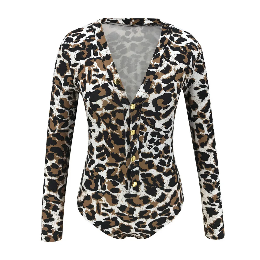 Осенняя женская обувь леопардовой расцветки с треугольным вырезом Облегающий мини-комбинезон с длинными рукавами