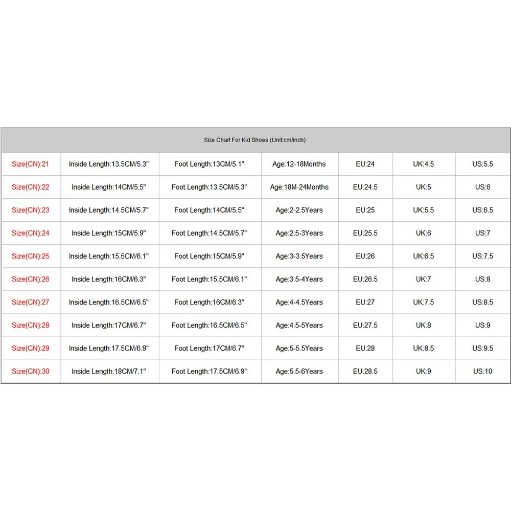 Таблица размеров для детской обуви (единица измерения: см/дюйм) Размер (CN):21 Внутренняя длина: 13,5 см/5,3 дюйма Длина стопы: 13 см/5,1 дюйма Возраст: 12-18Месяцев ЕС: 24 Великобритания: 4,5 Свяжитесь с нами: 5,5 Размер (CN):22 Внутренняя длина: 14 см/5,5 дюйма Длина стопы: 13,5 см/5,3 дюйма Возраст: размер на 18M-24Месяцев ЕС: 24,5 UK:5 Свяжитесь с нами: 6 Размер (CN):23 Внутренняя длина: 14,5 см/5,7 дюйма Длина стопы: 14 см/5,5 дюйма Возраст: размер на 2-2.5Years ЕС: 25 Великобритания: 5,5 Свяжитесь с нами: 6,5 Размер (CN):24 Внутренняя длина: 15 см/5,9 дюйма Длина стопы: 14,5 см/5,7 дюйма Возраст:2,5-3Лет ЕС: 25,5 UK:6 США: 7 Размер (CN):25 Внутренняя длина: 15,5 см/6,1 дюйма Длина стопы: 15 см/5,9 дюйма Возраст:3-3,5Лет ЕС: 26 Великобритания: 6,5 Свяжитесь с нами: 7,5 Размер (CN):26 Внутренняя длина: 16 см/6,3 дюйма Длина стопы: 15,5 см/6,1 дюйма АGe: 3,5-4 года ЕС: 26,5 UK:7 Свяжитесь с нами: 8 Размер (CN):27 Внутренняя длина: 16,5 см/6,5 дюйма Длина стопы: 16 см/6,3 дюйма Возраст:4-4,5Лет ЕС: 27 Великобритания: 7,5 Свяжитесь с нами: 8,5 Размер (CN):28 Внутренняя длина: 17 см/6,7 дюйма Длина стопы: 16,5 см/6,5 дюйма Возраст:4,5-5Лет ЕС: 27,5 UK:8 Свяжитесь с нами: 9 Размер (CN):29 Внутренняя длина: 17,5 см/6,9 дюйма Длина стопы: 17 см/6,7 дюйма Возраст: размер на 5-5.5Years ЕС: 28 Великобритания: 8,5 Свяжитесь с нами: 9,5 Размер (CN):30 Внутренняя длина: 18 см/7,1 дюйма Длина стопы: 17,5 см/6,9 дюйма Возраст: 5,5-6 лет ЕС: 28,5 UK:9 Свяжитесь с нами: 10