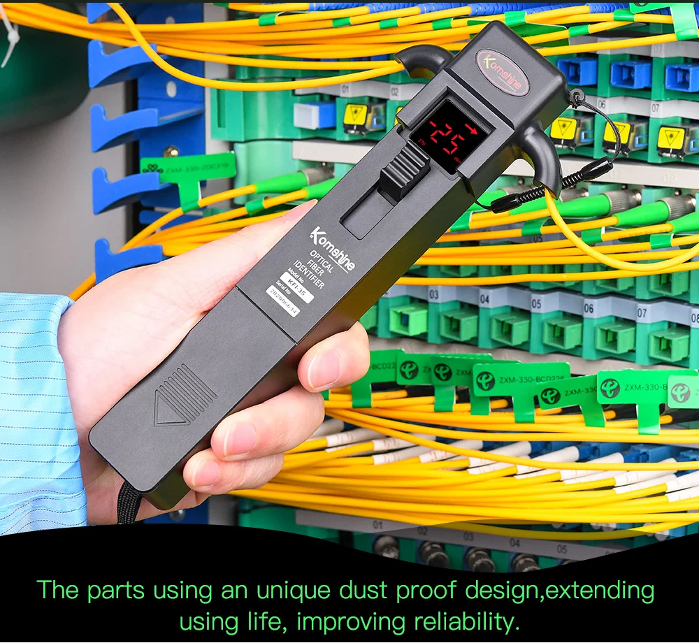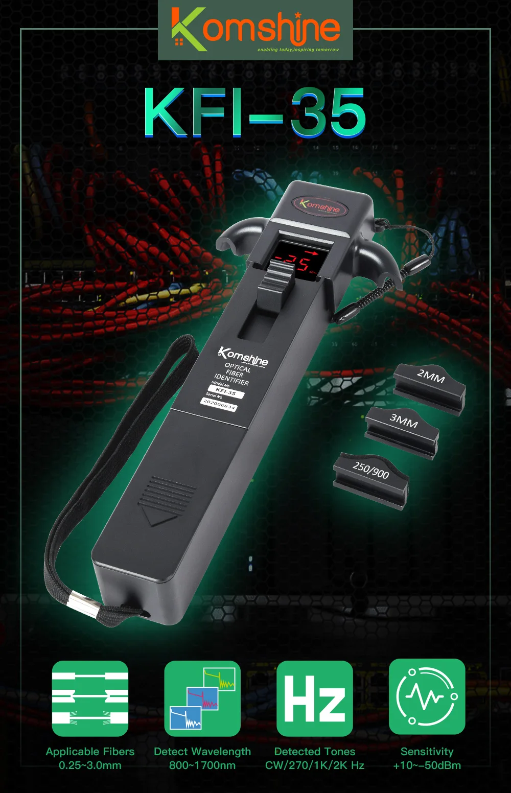 KomShine KFI-35 идентификации оптического волокна может быстро определить направление передаваемого волокна и отображать относительную мощность ядра без каких-либо повреждений гнутого волокна. Когда трафик присутствует, периодически включается звуковой сигнал.