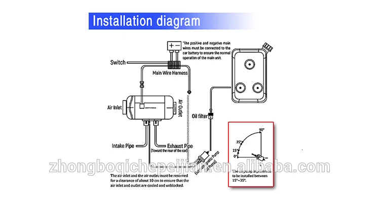 Parking heater is an intelligent controlled micro-burner, which uses diesel oil as fuel and is supplied by an oil pump. The atomized diesel oil is ignited by a high-temperature preheated ignition plug. It fully combusts in the combustion chamber and releases heat, which is blown away by the circulating fan and blown out hot air through the outlet to heat the low-temperature space to achieve heating.
