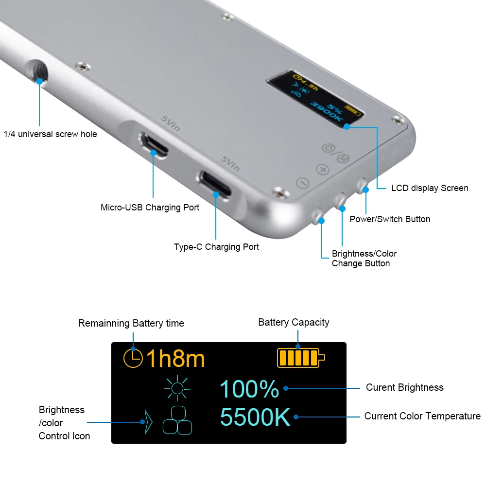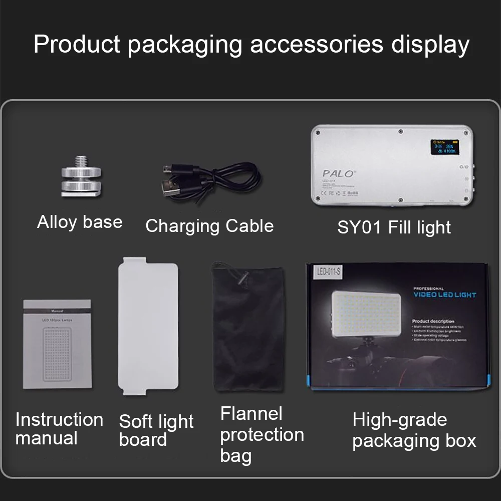 Название продукта: светодиодный фон для фотосъемки светильник Номер товара: BD21 Тип аккумулятора: литиевая батарея Емкость батареи: 4000mA Lmaps:180 шт Диапазон цветовой температуры: 3100k-5500k Светильник (лиминовый поток):1200 лм Вход: micro usb 5 В/2 А Тип C usb 5V/2A Светильник: 120 ℃ Цветопередача: ≥ 96 Средний час: 50000 ч Вес: 210 г ± 10 г Размер: 150,9 мм * 76 мм * 10 мм