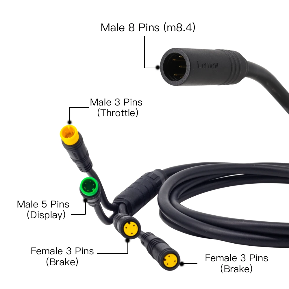 Бренд: lernew Модель: WE-E1T4Y Цвет: черный Вес: около 100 г Водонепроницаемый: IP65 Входной интерфейс: 8 Pin Выходной интерфейс: -Мужской Зеленый 5 контактов дисплей (G5.2) -Женский желтый 3 контакта левого тормоза -Мужской желтый 3 контакта дроссельной заслонки -Женский желтый 3 контакта Правый Тормоз Диапазон использования: для Bafang BBS BBS01 BBS02 BBSHD Mid Motor