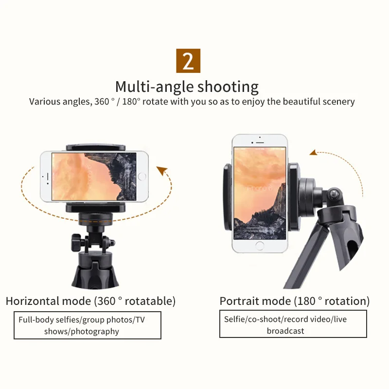 Мини-штатив для телефона может быть отрегулирован на 360 градусов, чтобы удовлетворить ваши потребности в различном угле. Он может удерживать ваш смартфон вертикально и горизонтально.